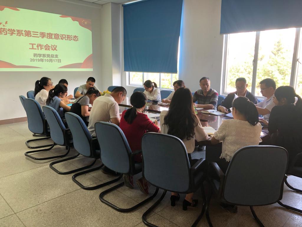2019年10月17日,藥學系黨總支在系部會議室召開第三季度意識形態(tài)工作會議。藥學系黨總支書記鄭力宏、副主任(主持工作)肖健、黨總支副書記賴文金、副主任潘雪豐、總支委員、各支部書記、教研室主任、實訓中心主任及全體輔導員到場參會,會議由黨總支書記鄭力宏主持。
