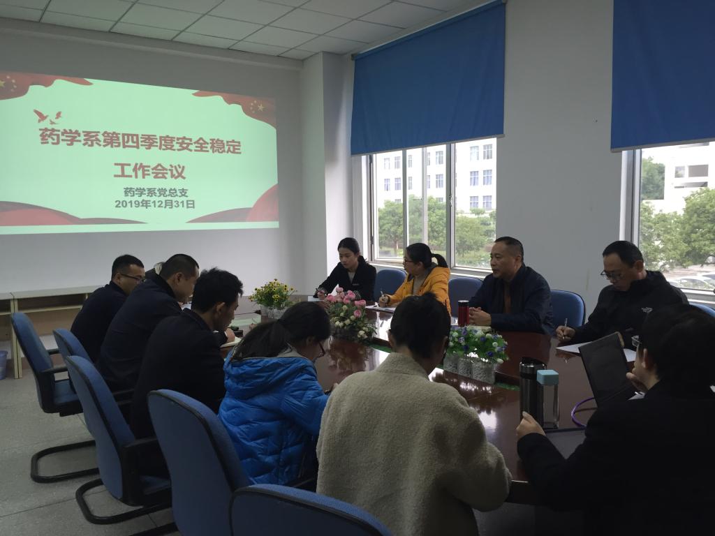 2019年12月31日,藥學(xué)系黨總支在系部會議室召開第四季度安全穩(wěn)定工作會議,藥學(xué)系黨總支書記鄭力宏、副主任(主持工作)肖健、黨總支副書記賴文金、副主任潘雪豐、總支委員、各支部書記、教研室主任、實訓(xùn)中心主任及全體輔導(dǎo)員到場參會,會議由黨總支書記鄭力宏主持。