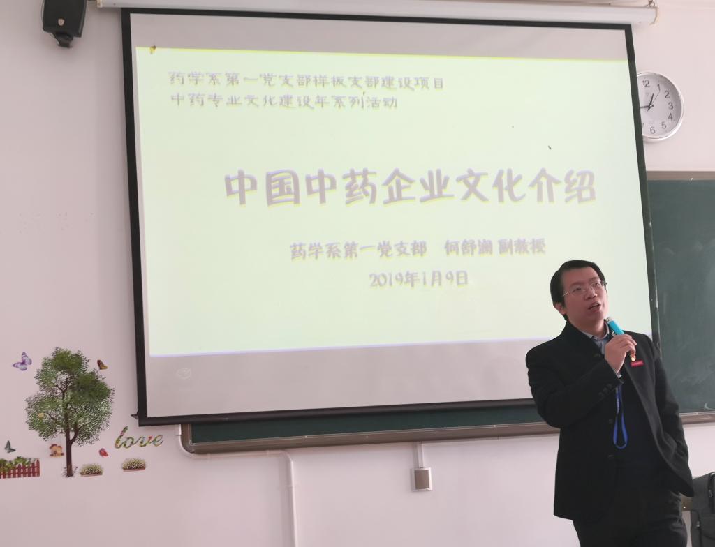 2020年1月9日,藥學(xué)系第一黨支部何舒瀾、林玲兩位同志在教學(xué)樓314為18級(jí)中藥全體同學(xué)開設(shè)講座——《中國(guó)中藥企業(yè)文化介紹》。