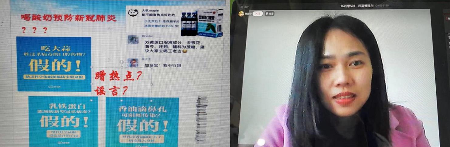 “佩戴口罩固然可以阻斷新冠病毒的飛沫傳播,但卻難以阻斷網絡“噴子”的飛沫傳播,培養(yǎng)學生的法律意識,幫助學生知法、守法,是《醫(yī)藥市場營銷》課程思政的切入點之一。” 藥經管教研室主任鄭煒老師侃侃而談,她是藥學系第一黨支部的優(yōu)秀黨員,這段時間她積極響應支部號召,組織人手制作了題為“萬眾一心,戰(zhàn)‘疫’有法”的H5,對疫情防控過程中容易被忽視的違法行為進行了宣傳,她主講的在線課程,通過“云班課”的頭腦風暴功能,組織學生分析熱點事件,堅定守法意識,受到學生們的歡迎。