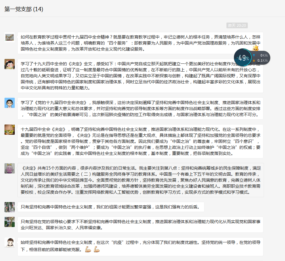 各黨員結(jié)合學(xué)習(xí)材料,積極交流學(xué)習(xí)心得。羅蘭同志表示在教育教學(xué)過程中要積極貫徹黨的十九屆四中全會精神,牢記立德樹人的根本任務(wù),弄清楚培養(yǎng)什么人,怎樣培養(yǎng)人,為誰培養(yǎng)人這三個問題,明確教育的“四個服務(wù)”:即教育要為人民服務(wù),為中國共產(chǎn)黨治國理政服務(wù),為鞏固和發(fā)展中國特色社會主義制度服務(wù),為改革開放和社會主義現(xiàn)代化建設(shè)服務(wù)。何舒瀾同志結(jié)合當(dāng)前疫情,從文件中看到了“中國之治”的美好前景,這次新冠肺炎疫情的防控工作取得突出成績,與國家治理體系和治理能力現(xiàn)代化密不可分。