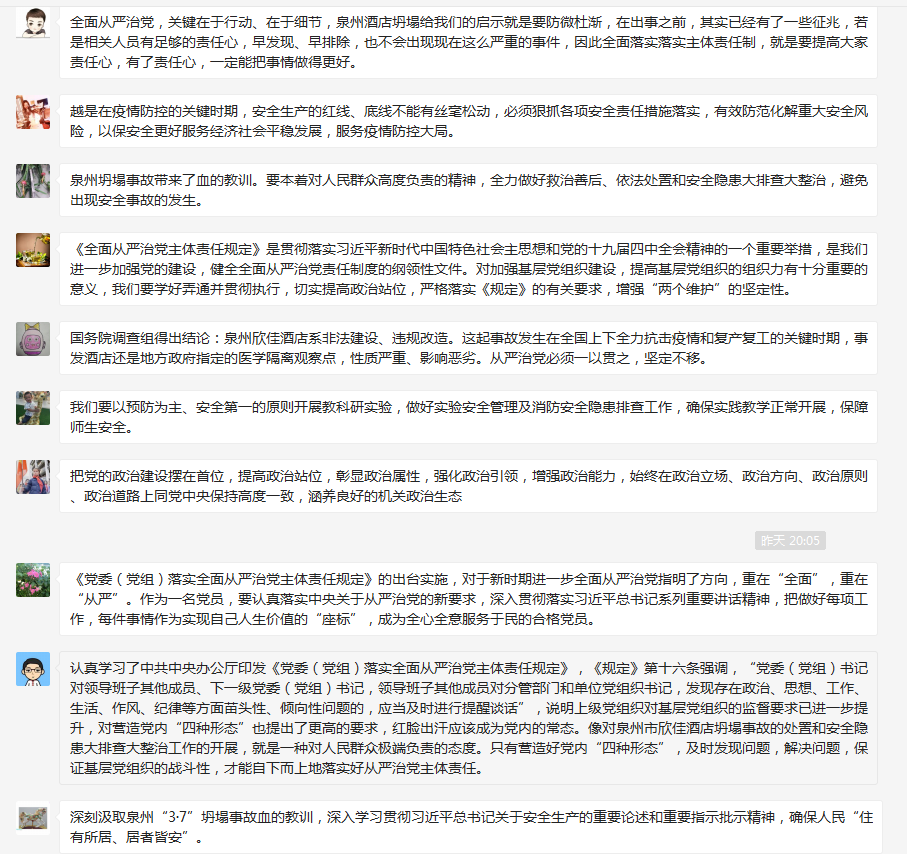 與會同志結合個人崗位實際交流心得,大家紛紛表示將深刻汲取泉州“3·7”坍塌事故血的教訓,以案示警中受警醒、明法紀,不僅如此,深入學習貫徹習近平總書記關于全面從嚴治黨重要論述,立足崗位,嚴格落實、積極為院系做貢獻。