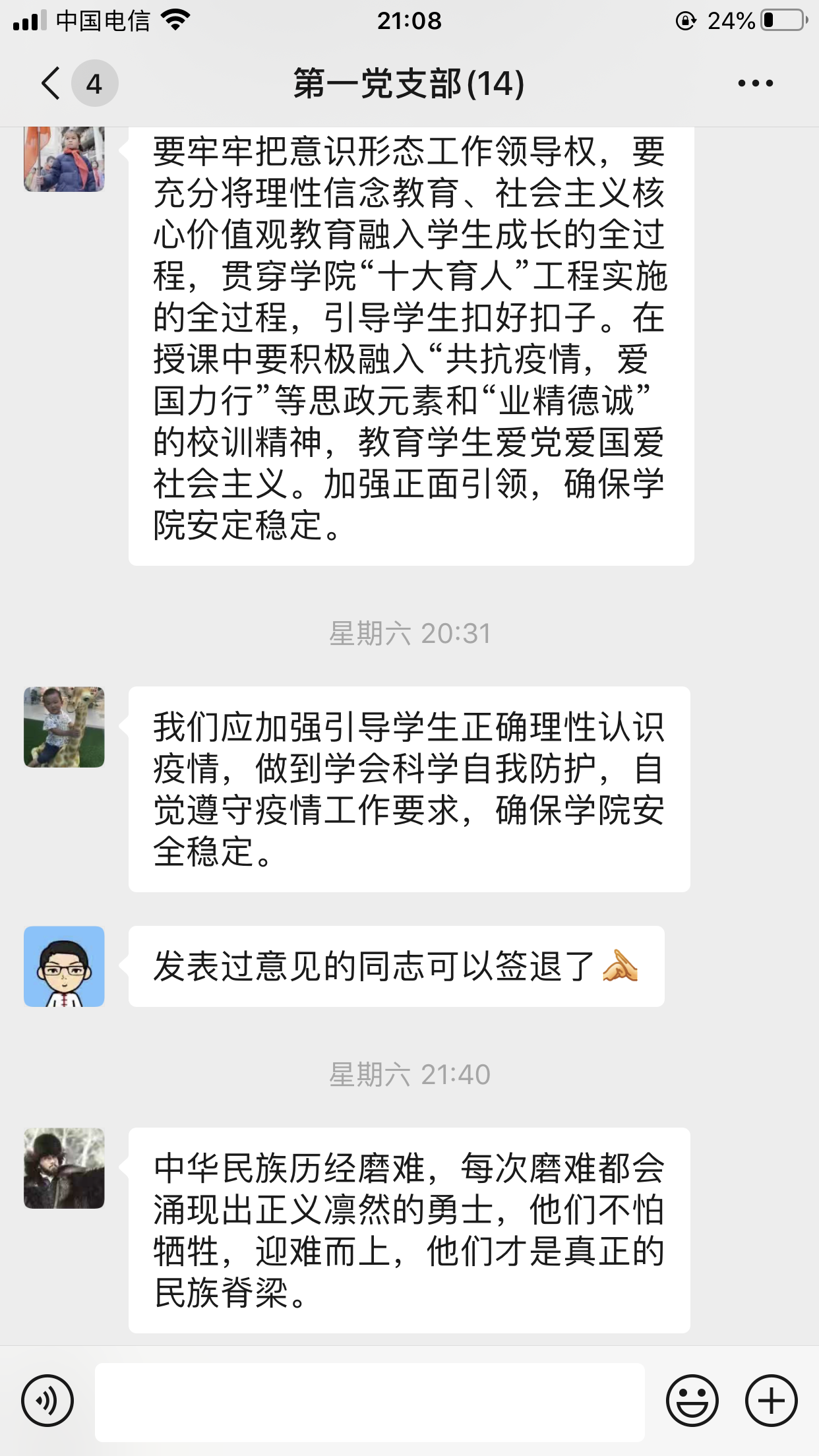 4月4日,藥學(xué)系第一黨支部在線集中學(xué)習(xí)傳達(dá)了“學(xué)院2020年第一季度意識(shí)形態(tài)工作會(huì)議及黨總支書記(擴(kuò)大)會(huì)議”精神。