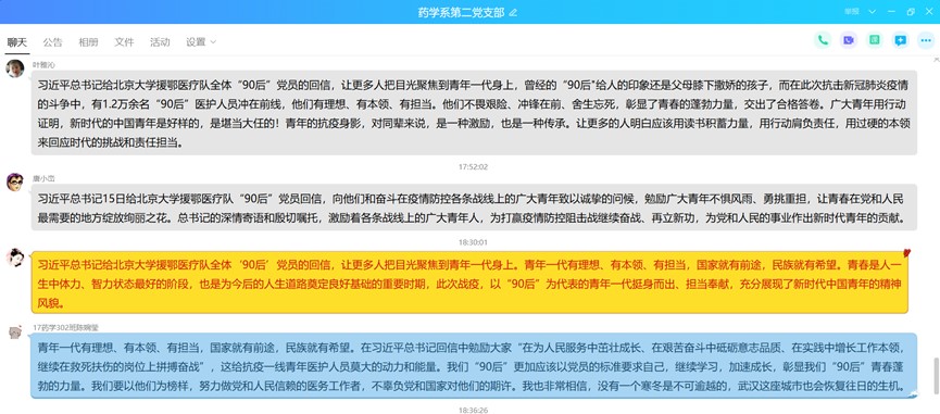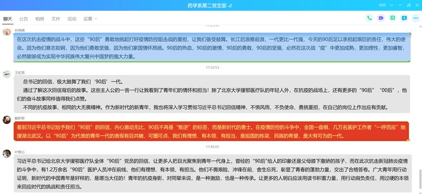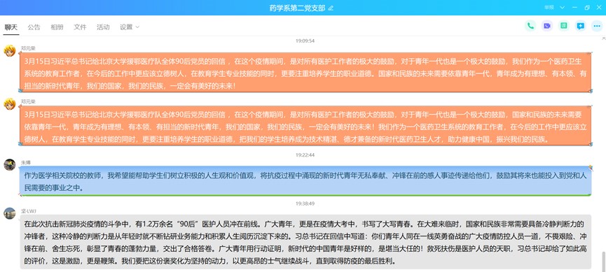 疫情防控是一場人民戰(zhàn)爭,每個黨員都是一面旗幟,可以感召一群人、帶動一群人,匯聚起更強(qiáng)大的戰(zhàn)疫力量,在疫情防治攻堅時間,習(xí)近平總書記回信勉勵北京大學(xué)援鄂醫(yī)療隊全體“90后”,給優(yōu)秀的青年醫(yī)務(wù)工作者發(fā)出了最強(qiáng)音量。為深入學(xué)習(xí)貫徹落實習(xí)近平總書記的回信精神,2020年3月26日,藥學(xué)系第二黨支部開展“抗疫路上,共同的初心”主題黨日活動,學(xué)習(xí)“習(xí)近平回信勉勵北京大學(xué)援鄂醫(yī)療隊全體“90后”,將疫情防控工作落實到具體的教學(xué)工作中。