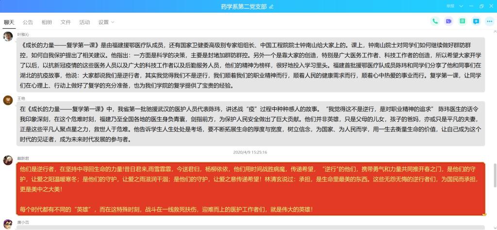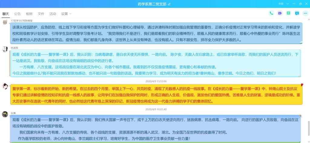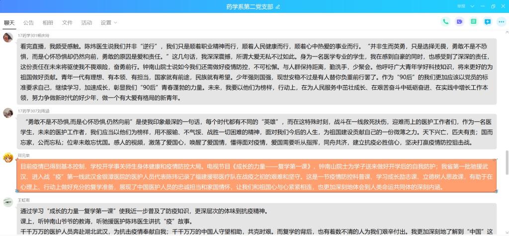 節(jié)目結(jié)束后,支部成員于線上集合紛紛發(fā)表觀后感。這是一節(jié)疫情防控科普課、學(xué)習(xí)成長(zhǎng)勵(lì)志課、立德樹人思政課,展現(xiàn)了中國(guó)醫(yī)護(hù)人員的忠誠(chéng)擔(dān)當(dāng)和家國(guó)情懷,讓我們和祖國(guó)心與心緊緊相連,也更加深刻地體會(huì)到人類命運(yùn)共同體的深刻內(nèi)涵。同時(shí),作為醫(yī)學(xué)院校的老師,我們應(yīng)當(dāng)積極向鐘南山、李蘭娟院士們學(xué)習(xí),培育好學(xué)生,為中國(guó)的醫(yī)療衛(wèi)生事業(yè)貢獻(xiàn)一份力量!