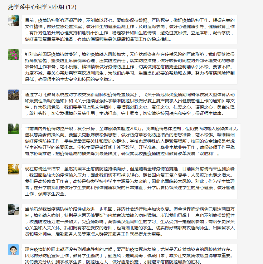 2020年4月16日,藥學(xué)系黨總支在微信群召開中心組學(xué)習(xí)(擴大)會議,會議由藥學(xué)系黨總支書記鄭力宏主持。