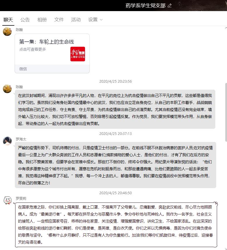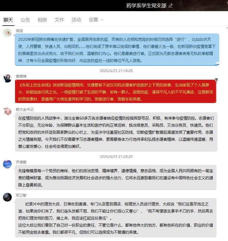 “這是生我養(yǎng)我的城市,我想總得有一束光,照亮大家前行的路”,平凡的人物、不平凡的貢獻(xiàn),4月25日晚,藥學(xué)系學(xué)生黨支部通過(guò)QQ平臺(tái)集中觀看學(xué)習(xí)“在武漢”系列記錄宣傳片第一集——車輪上的生命線,支部全體黨員觀看學(xué)習(xí)。
