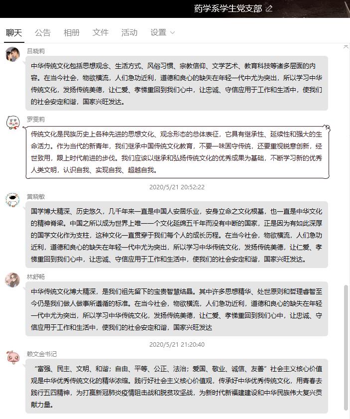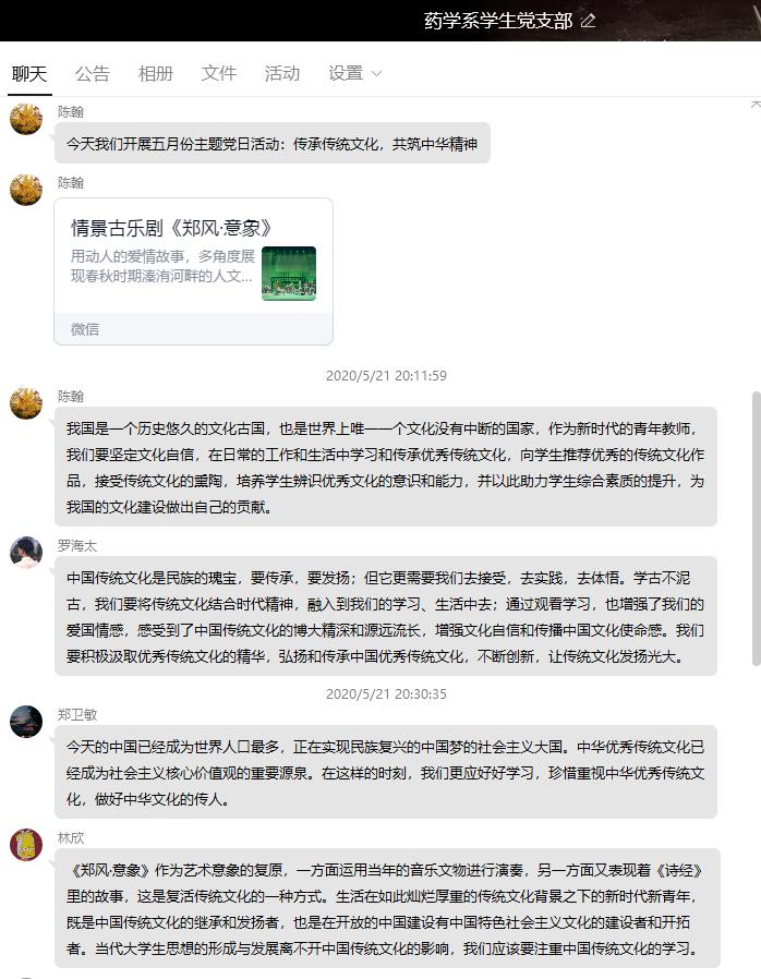 我國是一個(gè)歷史悠久的文化古國,也是世界上唯一一個(gè)文化沒有中斷的國家。為傳承中華優(yōu)秀傳統(tǒng)文化,5月21日,藥學(xué)系學(xué)生黨支部開展線上黨日活動(dòng),集體觀看情景古樂劇《鄭風(fēng)·意象》。
