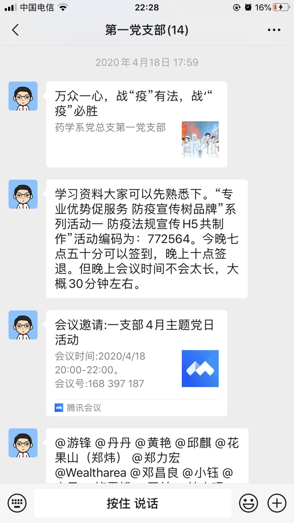 4月18日,藥學(xué)系第一黨支部開展“遵守疫情防控相關(guān)法律法規(guī)”防疫宣傳主題黨日活動。本次活動,支部全體黨員同志分為5個服務(wù)小組,通過網(wǎng)上平臺為藥學(xué)系一至三年級近500名學(xué)生開展疫情防控宣傳,師生在線共同學(xué)習(xí),開展交流。