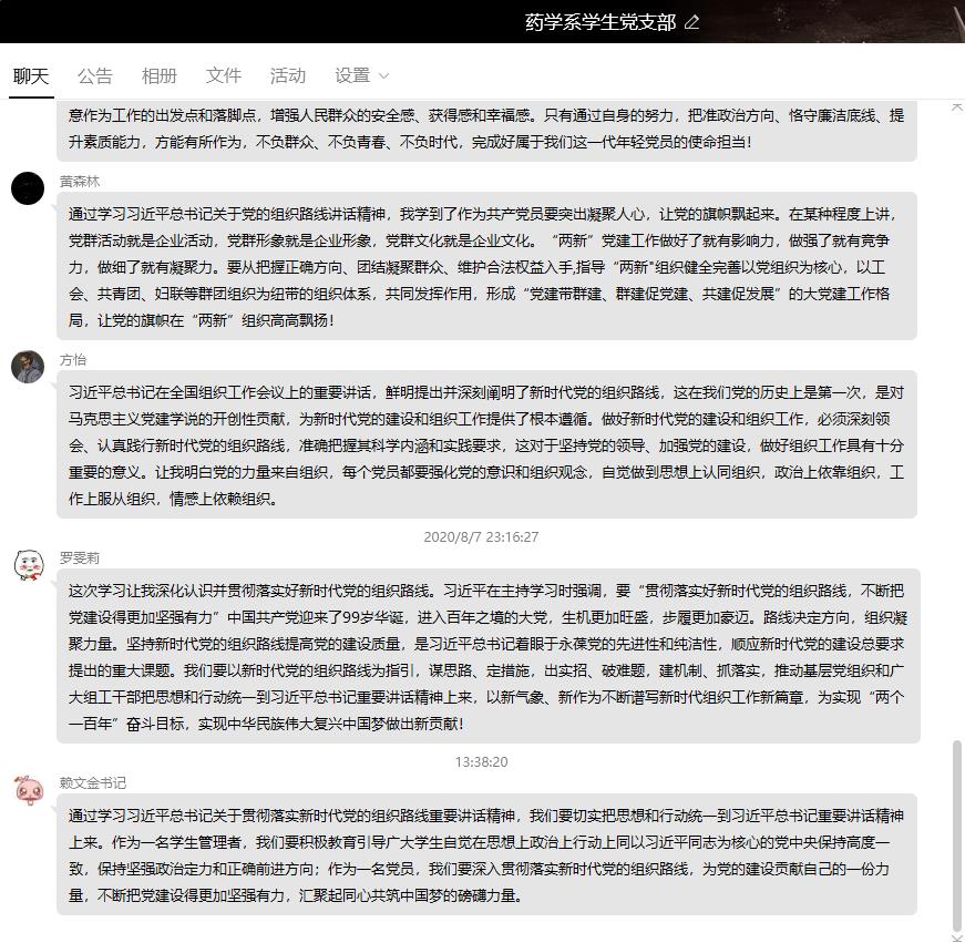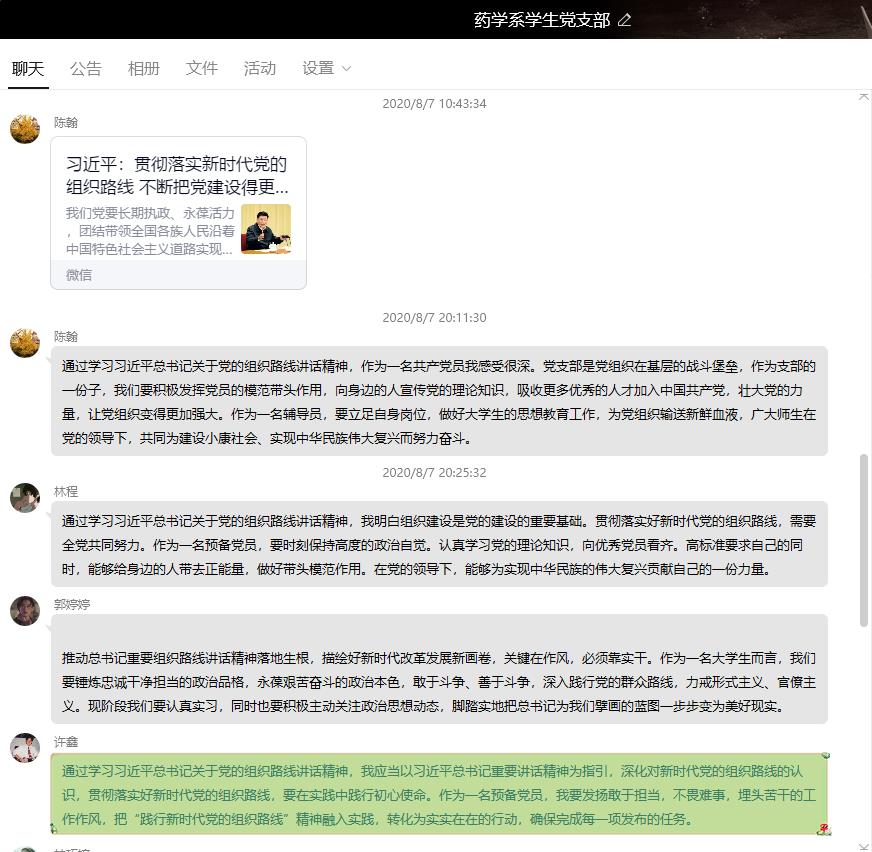 習近平總書記曾指出,“我們黨要長期執(zhí)政、永葆活力,團結(jié)帶領(lǐng)全國各族人民沿著中國特色社會主義道路實現(xiàn)中華民族偉大復(fù)興,最重要的是把黨建設(shè)得更加堅強有力”。8月7日,藥學系學生黨支部通過QQ平臺,集中學習習近平“貫徹落實新時代黨的組織路線,不斷把黨建設(shè)得更加堅強有力”講話精神,支部全體師生黨員參與學習。