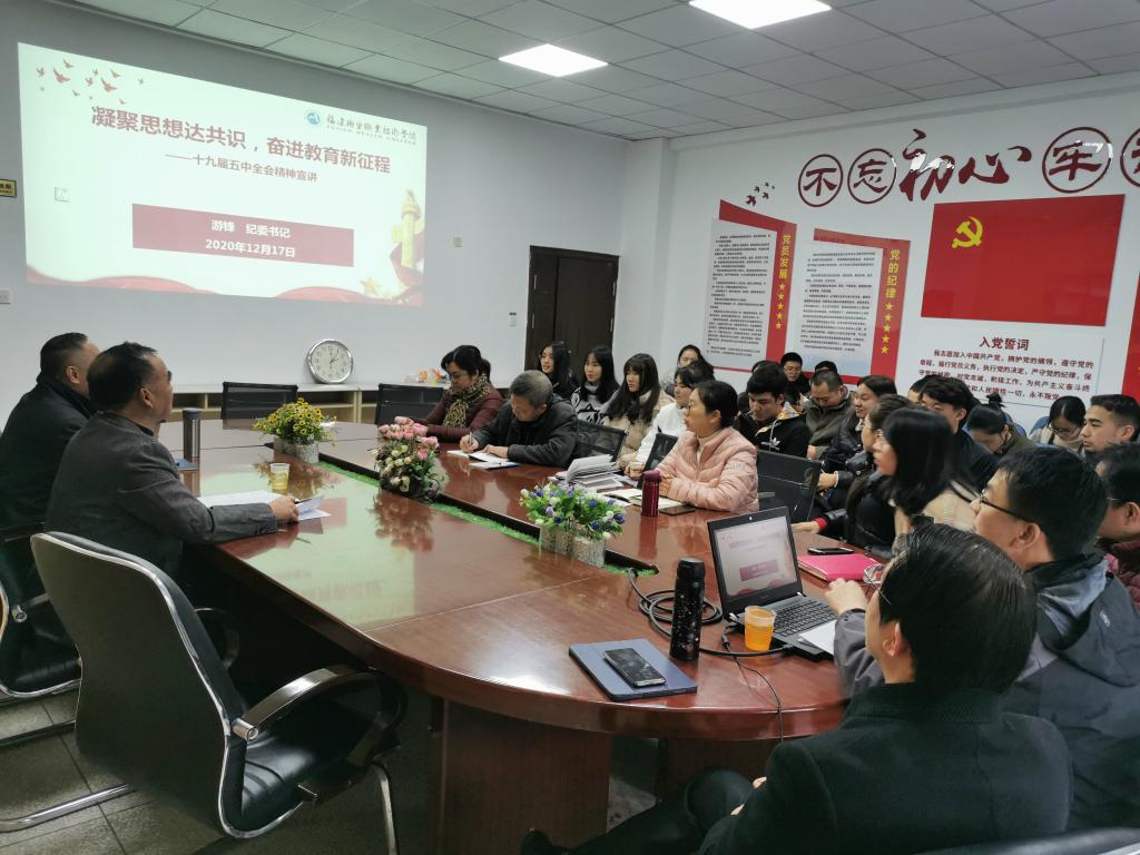 課上,游鋒首先回顧了十九屆五中全會(huì)會(huì)議內(nèi)容,并從“辦學(xué)規(guī)模和質(zhì)量不斷攀升、教學(xué)改革成效顯著、智慧校園基本成型、推進(jìn)校內(nèi)外實(shí)訓(xùn)基地建設(shè)”等四個(gè)方面詳細(xì)闡述了我校教育發(fā)展“十三五”期間取得的顯著成就,最后,立足學(xué)校實(shí)際,結(jié)合高水平職業(yè)院校建設(shè)十大工程重點(diǎn)解讀了學(xué)?!笆奈濉苯ㄔO(shè)發(fā)展計(jì)劃。