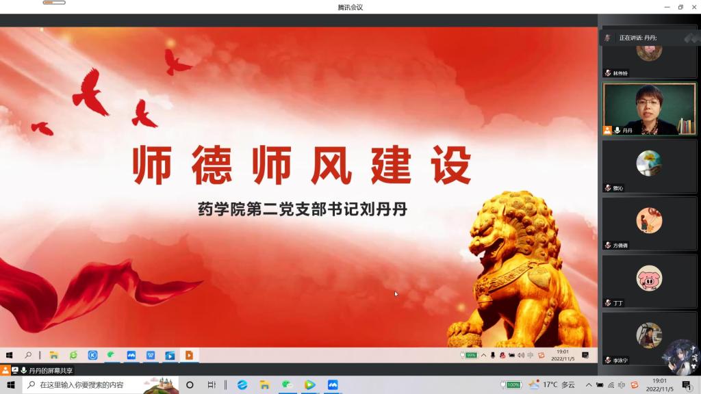 為了進一步學習貫徹黨的二十大精神,提升黨員教師的思想政治素質(zhì)和職業(yè)道德水平,2022年11月5日,藥學院第二黨支部書記劉丹丹在線上圍繞師德師風建設為支部黨員帶來了一堂精彩的黨課。
