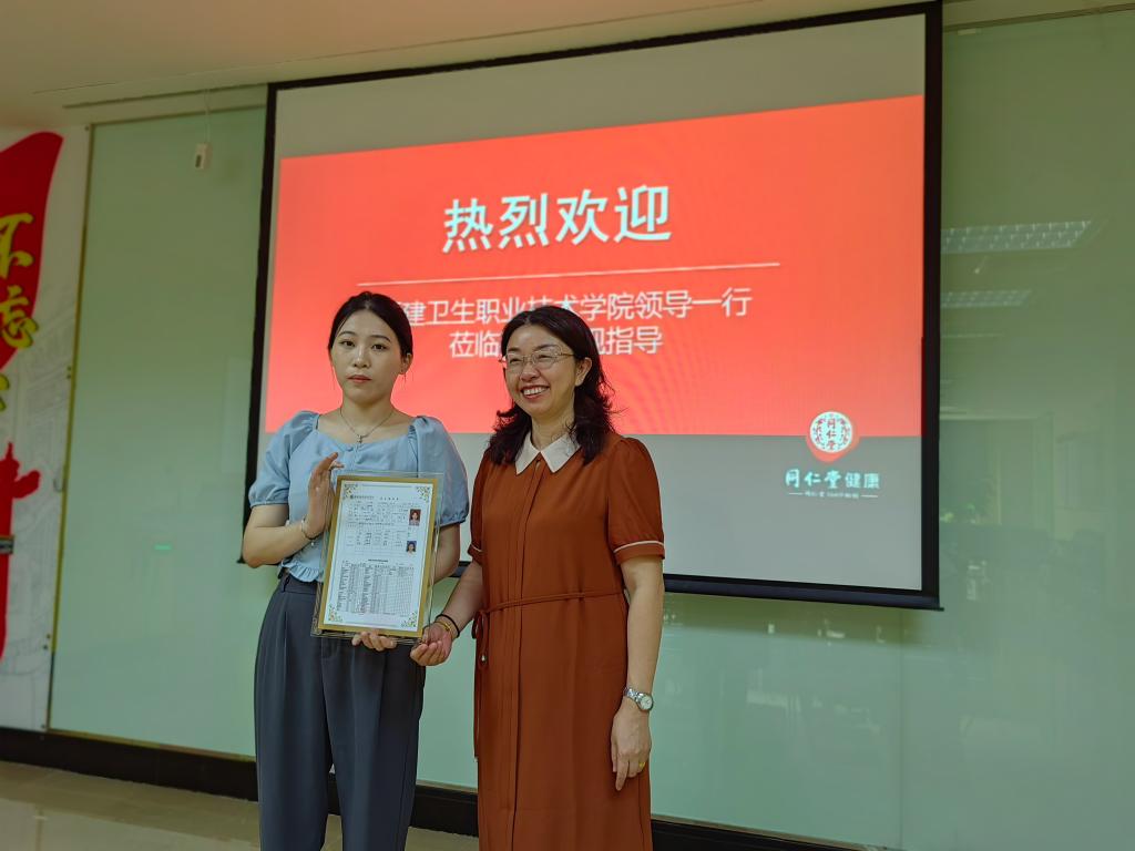 聯(lián)系領(lǐng)導副校長黃銘珊在北京同仁堂訪企拓崗時為校友頒發(fā)校友卡