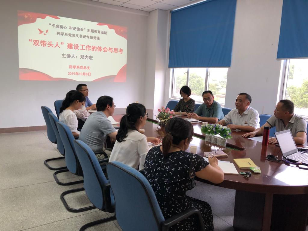 10月8日下午,藥學(xué)系黨總支在系部會(huì)議室開(kāi)展 “‘雙帶頭人’建設(shè)工作的體會(huì)與思考”主題教育專(zhuān)題黨課。藥學(xué)系黨總支書(shū)記鄭力宏主講,學(xué)院第四巡回指導(dǎo)小組組長(zhǎng)、紀(jì)委書(shū)記游鋒、護(hù)理系黨總支組織員許慧瓊、藥學(xué)系副主任肖?。ㄖ鞒止ぷ鳎Ⅻh總支副書(shū)記賴(lài)文金、副主任潘雪豐及總支支委、支部書(shū)記參加了本次黨課。