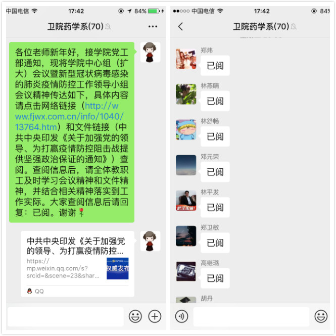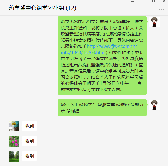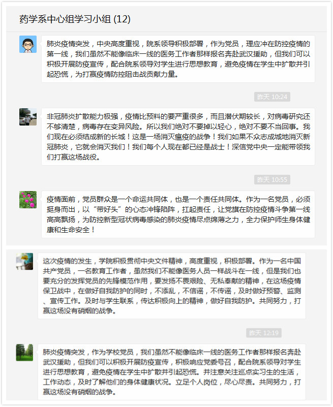 藥學(xué)系根據(jù)不同群體多形式開展學(xué)習(xí)活動。藥學(xué)系全體教職工通過微信群,詳細閱讀學(xué)習(xí)材料;各教研室組織教師圍繞學(xué)習(xí)內(nèi)容展開探討;中心組(擴大)成員根據(jù)工作實際發(fā)表學(xué)習(xí)體會;各輔導(dǎo)員通過qq視頻會議召開主題班會;各班級同學(xué)通過qq語音交流學(xué)習(xí)心得。