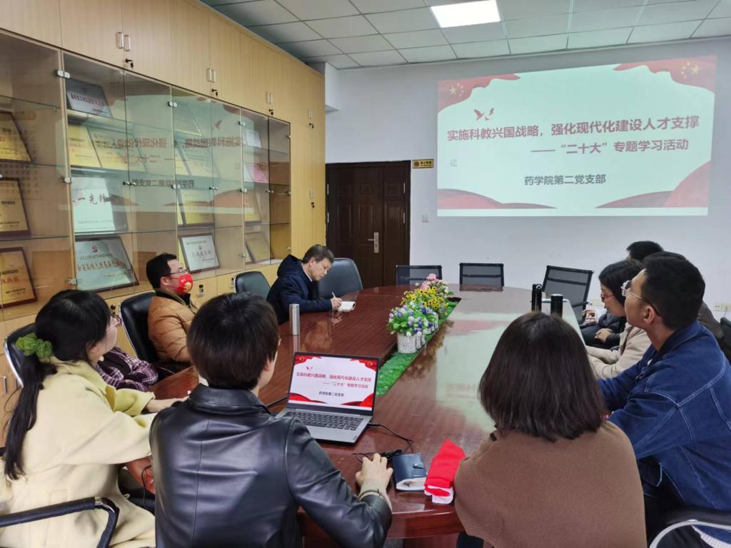 為進(jìn)一步學(xué)習(xí)宣傳貫徹好黨的二十大精神,2023年1月5日,藥學(xué)院第二黨支部書記圍繞“實(shí)施科教興國(guó)戰(zhàn)略,強(qiáng)化現(xiàn)代化建設(shè)人才支撐”開展主題黨日專題學(xué)習(xí)。本次活動(dòng)由支部書記劉丹丹主持。