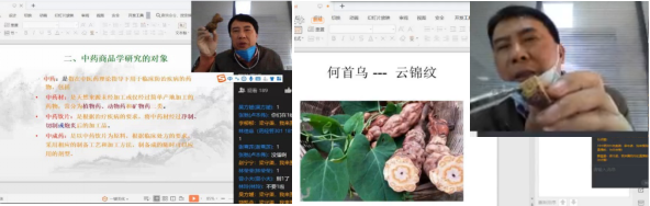 除了專任教師,外聘教師們在中藥教研室教師的協(xié)助下,也都開展了良好的在線教學(xué)。瑞來春堂的梁守渠老師是《中藥商品學(xué)》的任課老師,每次上課時都精心準(zhǔn)備了各種中藥材標(biāo)本,通過直播展示給學(xué)生們看,邊展示邊講授,學(xué)生反應(yīng)很好。