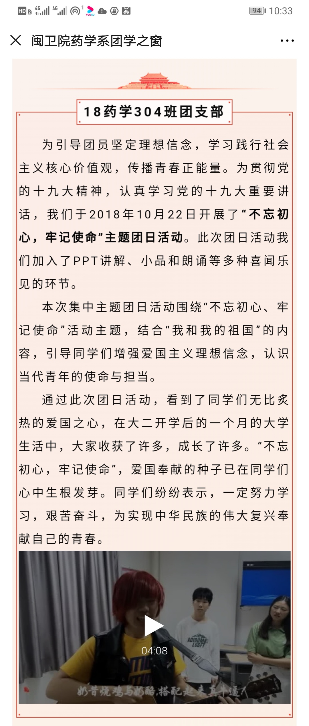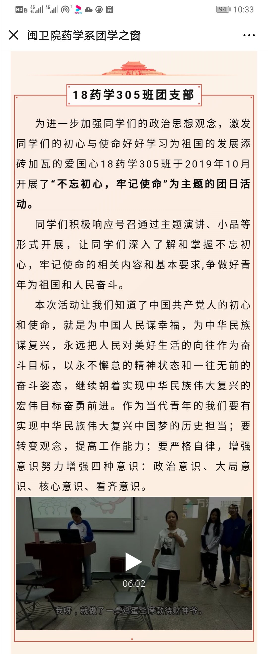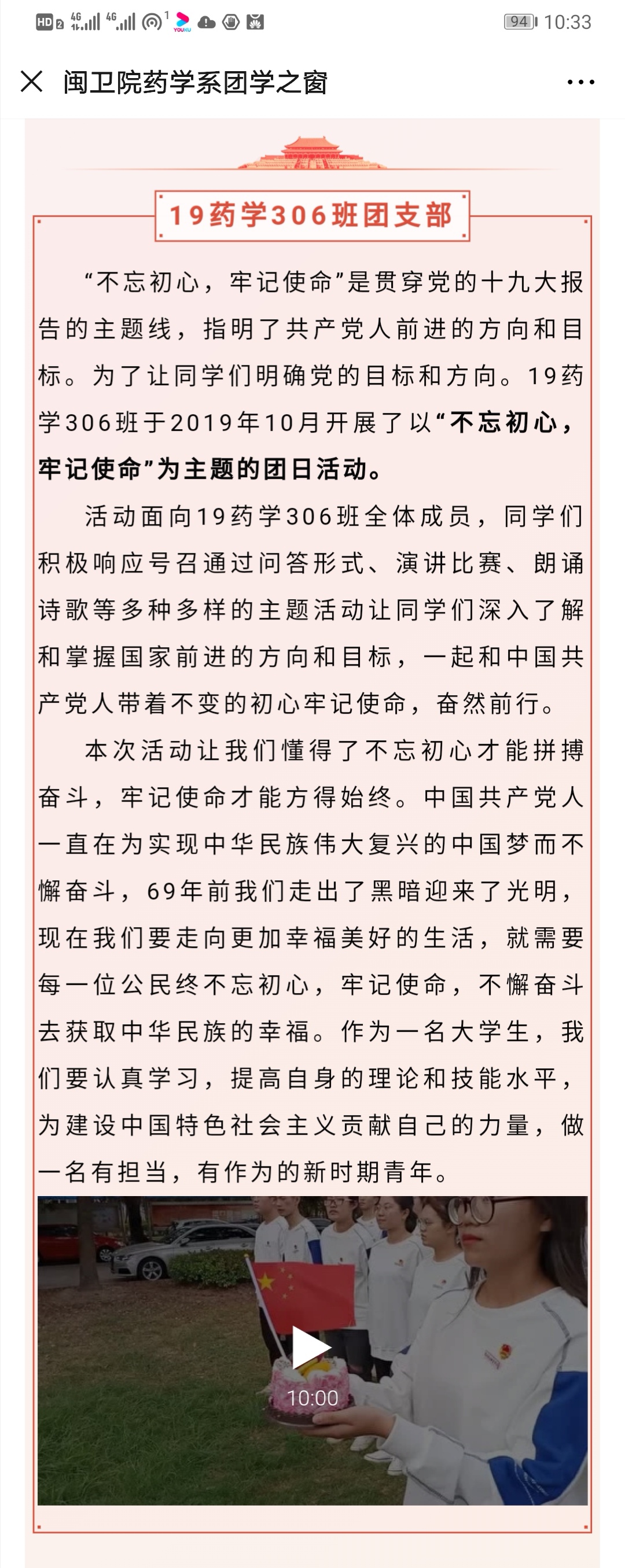 為進一步推進從嚴治團,激發(fā)基層團支部活力,發(fā)揮主題團日活動在青年學生中思想引領(lǐng)、價值引領(lǐng)作用,促進主題團日活動制度化、規(guī)范化,增強基層團組織的凝聚力、影響力,藥學系于2019年10月開展了以“不忘初心、牢記使命”為主題的團日活動。