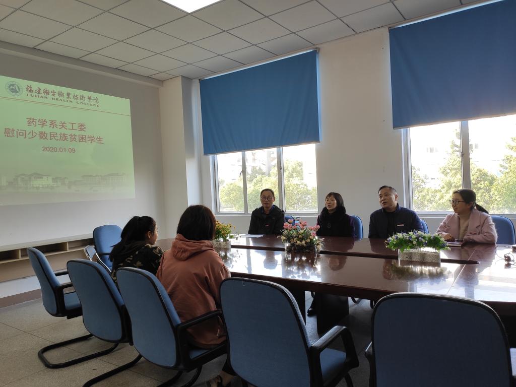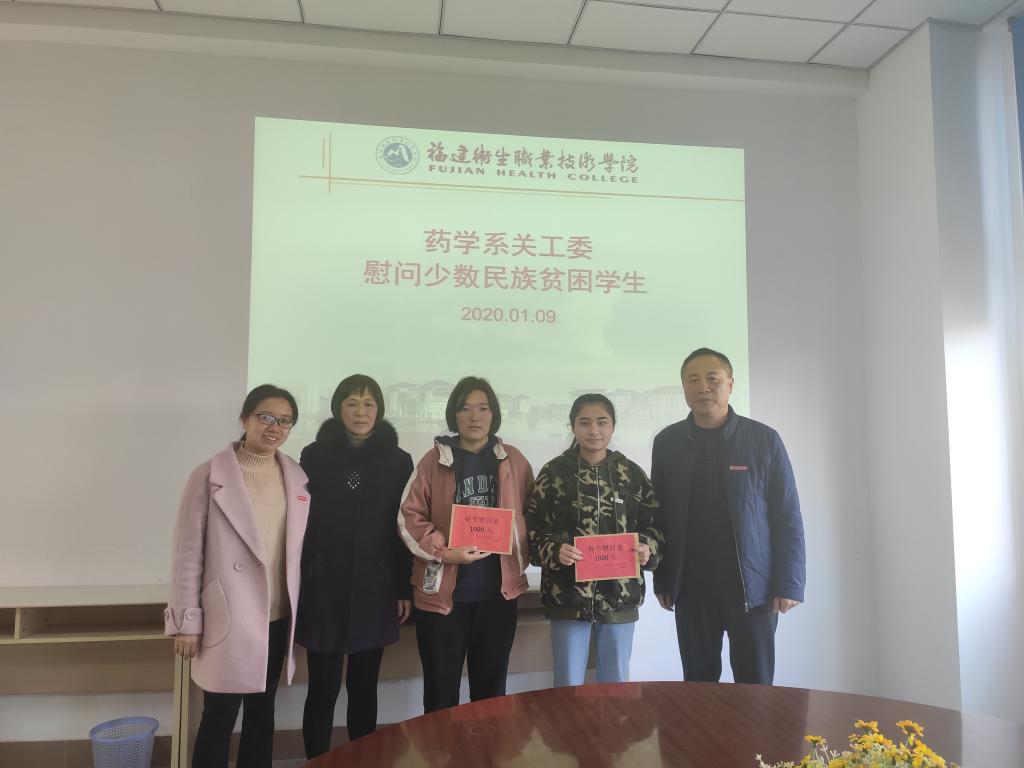 寒假將至,為了貫徹黨的十九大精神,把黨和國(guó)家對(duì)家庭經(jīng)濟(jì)困難學(xué)生的關(guān)懷落實(shí)落細(xì),把學(xué)生資助工作做“暖心”,確保家庭經(jīng)濟(jì)困難少數(shù)民族學(xué)生度過(guò)一個(gè)溫暖祥和的春節(jié),1月9日下午,藥學(xué)系在207會(huì)議室舉辦“冬季送溫暖”慰問(wèn)貧困學(xué)生活動(dòng)。藥學(xué)系黨總支鄭力宏書(shū)記、肖健副主任、關(guān)工委黃聲嵐老師和黨總支賴文金副書(shū)記熱情慰問(wèn)了藏族和維族貧困學(xué)生。