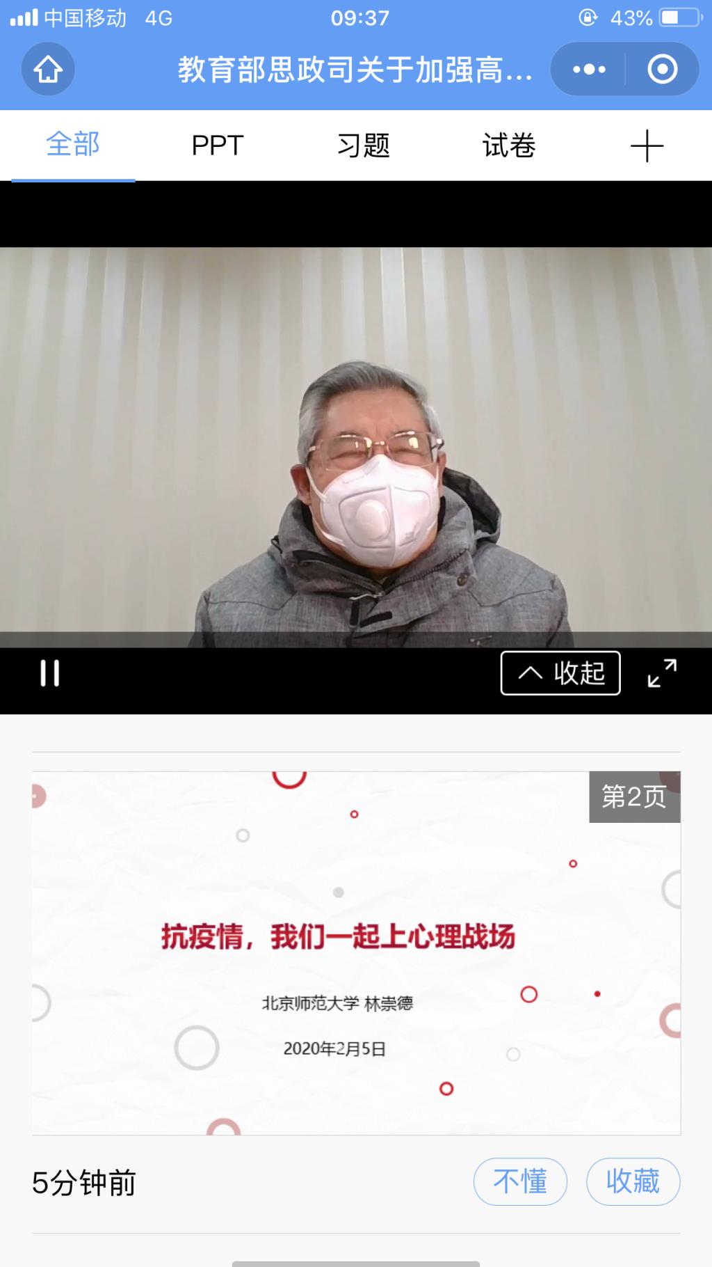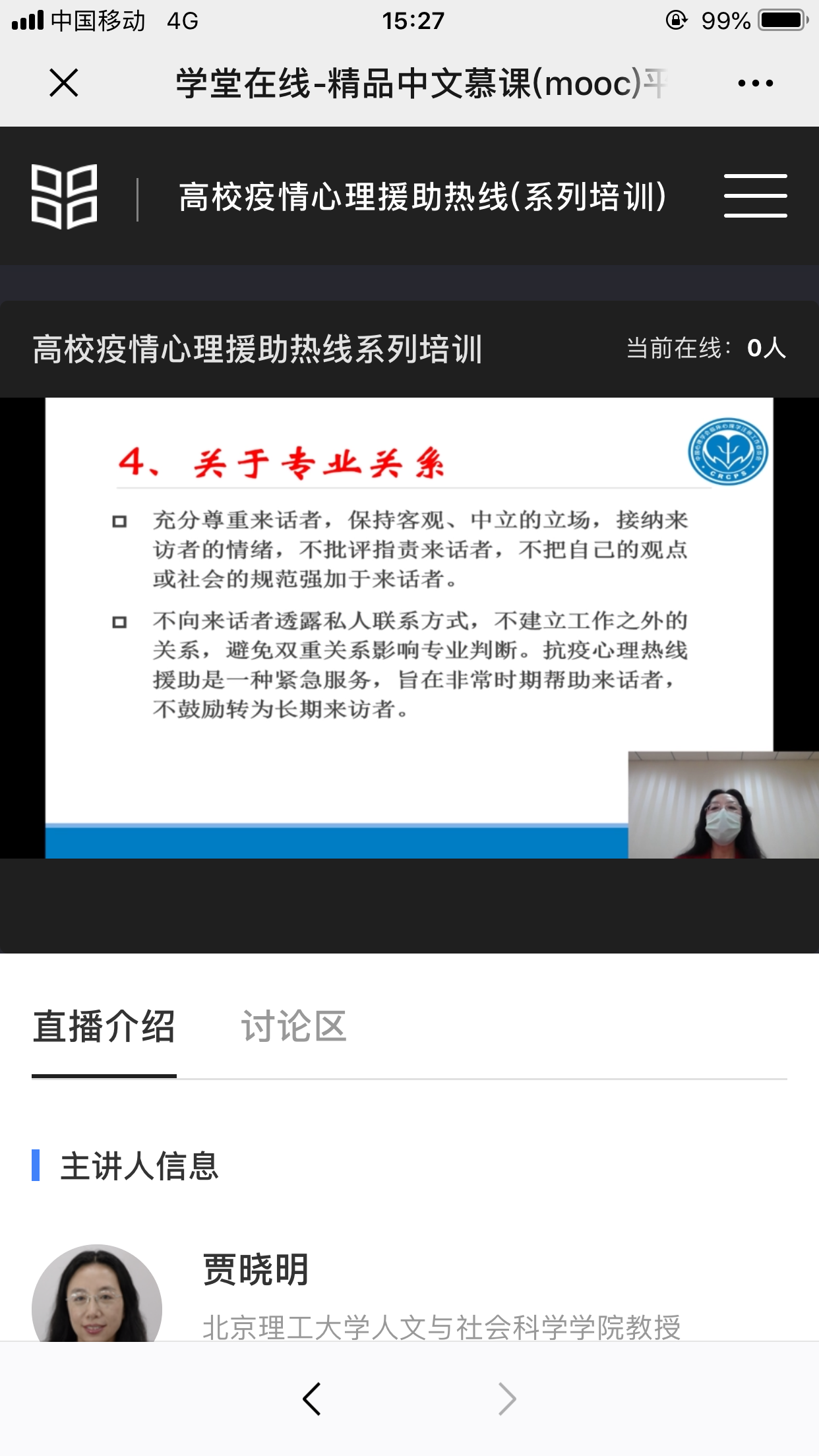 同時(shí),我系輔導(dǎo)員積極參與教育部思想政治工作司組織的加強(qiáng)高校疫情心理援助熱線培訓(xùn),認(rèn)真學(xué)習(xí)其中《高校心理援助熱線》相關(guān)課程,通過(guò)培訓(xùn)進(jìn)一步提高自身心理素質(zhì)和學(xué)生心理輔導(dǎo)技能。