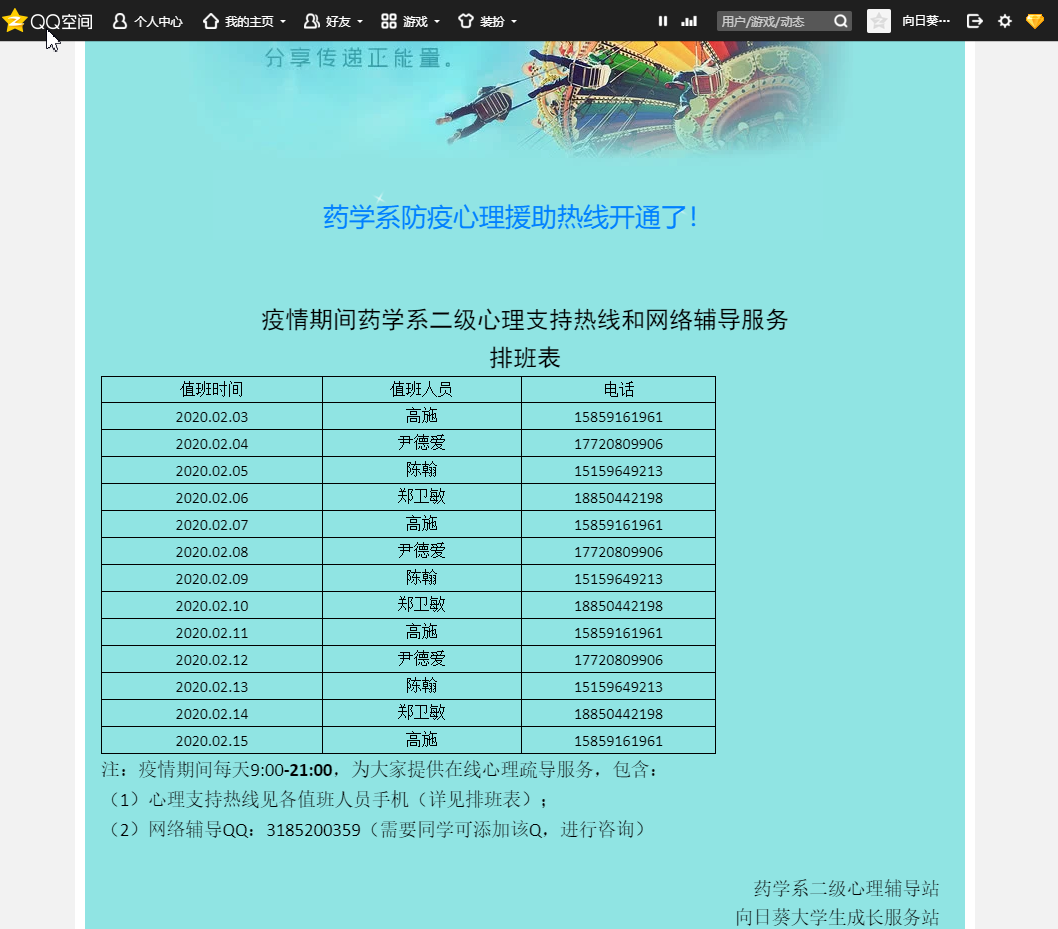 疫情期間開(kāi)通藥學(xué)系二級(jí)心理支持熱線,并在向日葵大學(xué)生成長(zhǎng)服務(wù)站QQ空間發(fā)布網(wǎng)絡(luò)輔導(dǎo)服務(wù)值班安排表。