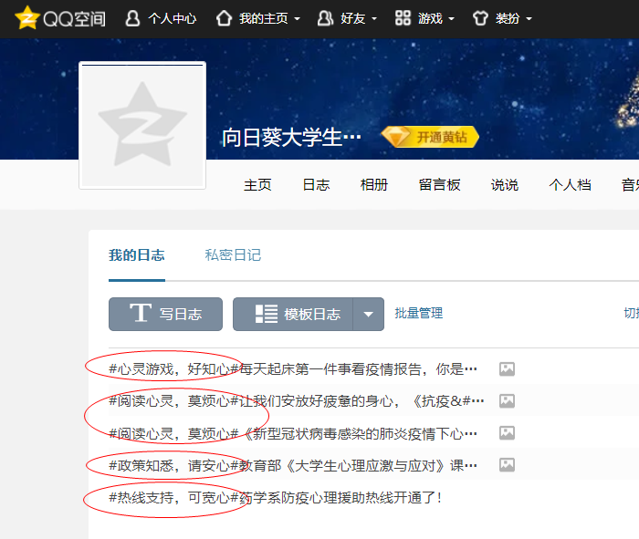 向日葵大學(xué)生成長(zhǎng)服務(wù)站QQ由專門團(tuán)隊(duì)管理,與全系師生互加好友,每天在線接受咨詢,并采用學(xué)生喜聞樂(lè)見(jiàn)的空間日志、優(yōu)秀網(wǎng)文等形式,讓學(xué)生隨時(shí)隨地感受到藥學(xué)系心理健康的守護(hù),引導(dǎo)學(xué)生以良好樂(lè)觀的心理狀態(tài)積極應(yīng)對(duì)疫情。