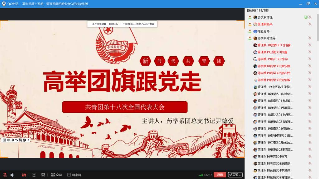 2020年3月5日,為響應(yīng)停課不停學(xué)的號(hào)召,藥學(xué)系團(tuán)總支書記尹德愛(ài)老師利用QQ線上直播的方式為藥學(xué)系第十五期、管理系第四期業(yè)余分團(tuán)校的學(xué)員們講授了主題為“高舉團(tuán)旗跟黨走”的開(kāi)班第一課。