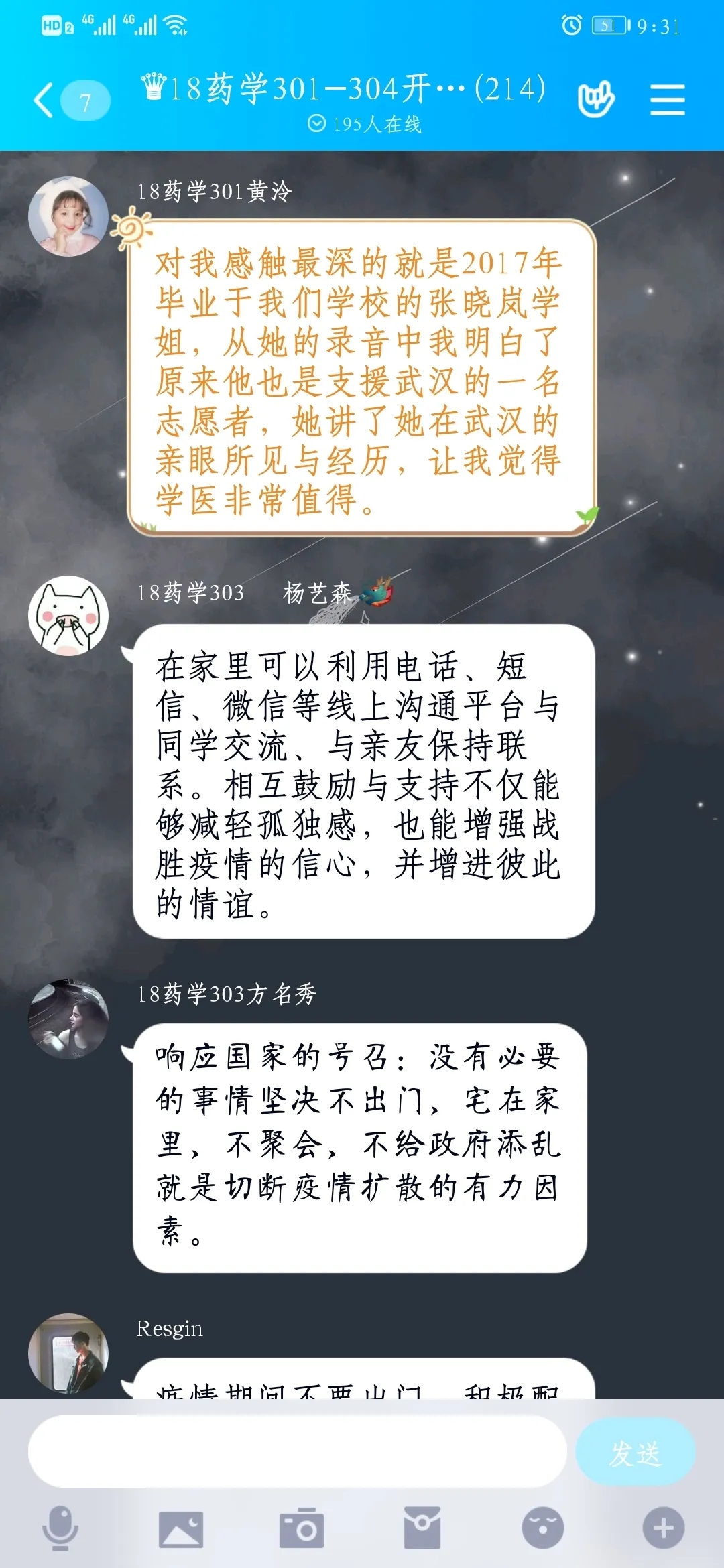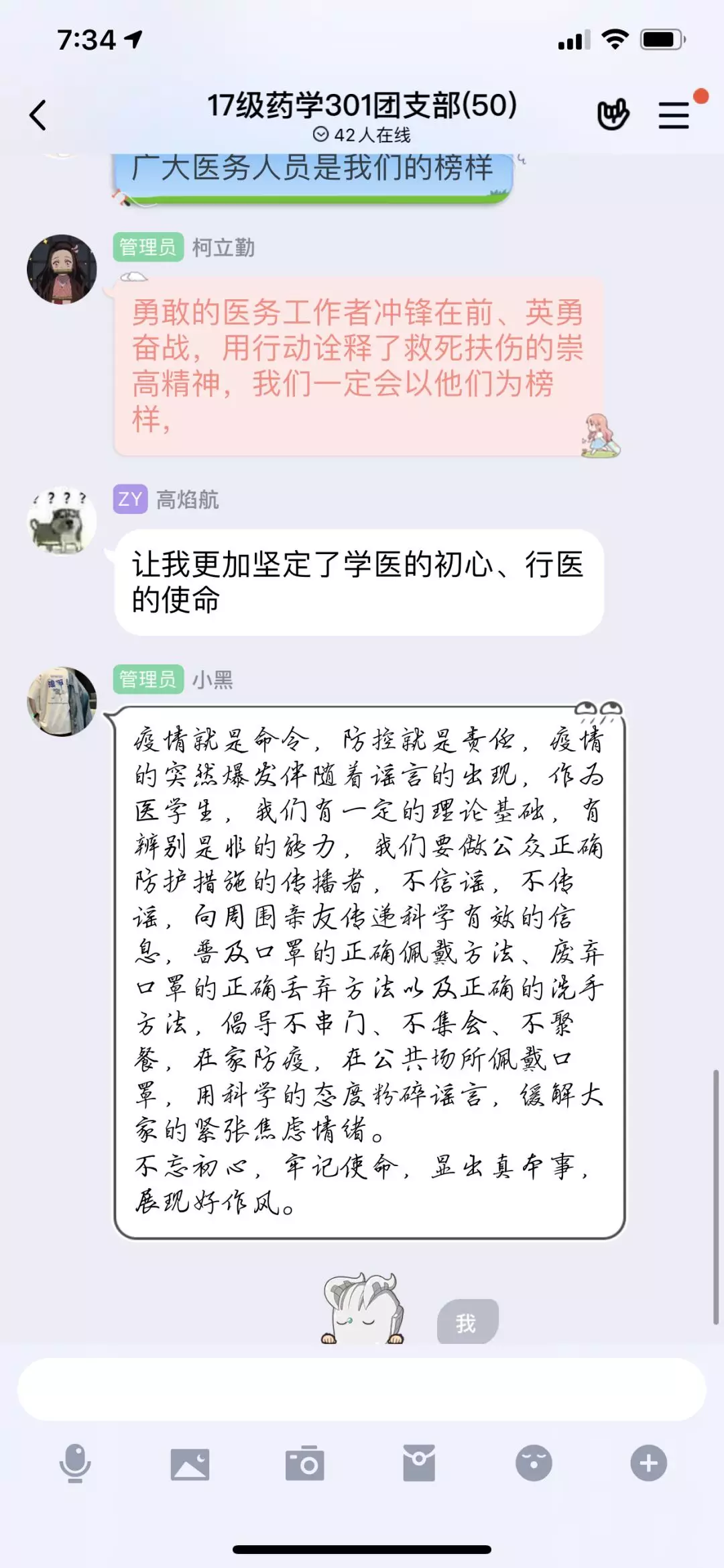 17藥學301班楊慶玲同學說:這封回信既是對醫(yī)學生的鼓勵,也是對逆行奮戰(zhàn)在抗疫前線、救死扶傷的廣大醫(yī)護工作者的鼓舞與肯定,而作為同樣在外實習的我而言,在疫情當前,雖不能“逆行奮戰(zhàn)”在抗疫前線,但是我仍時時刻刻關注著疫情。我會好好學習,把所學用到實處,理論聯(lián)系實際,用實際行動做一位黨和人民都信賴的醫(yī)護工作者。18藥學306班林櫟同學說:在這封回信中習近平總書記高度肯定了醫(yī)生是人民健康的守護者,高度贊揚了醫(yī)生用行動詮釋了白衣天使救死扶傷的崇高精神!這群兢兢業(yè)業(yè)、無私奉獻的醫(yī)學生志愿者,用實際行動生動地詮釋了當代青年學子的作為與擔當,他們不怕苦累、不懼疫情,用專業(yè)和敬業(yè),用信念和執(zhí)著,真切地展示了團員青年的時代風采,我們應當向他們學習。