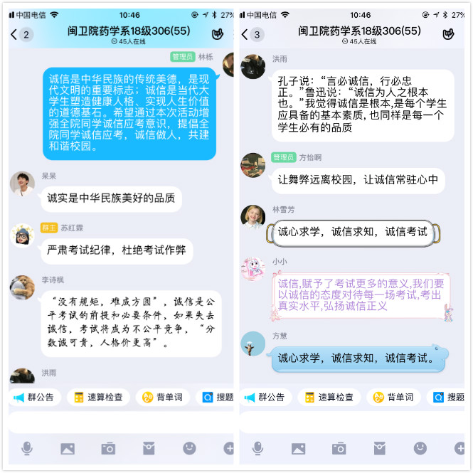 此次考試將采取線上考試形式,這是一次與眾不同的期中考試,不僅考驗(yàn)同學(xué)們對知識的掌握程度,更考驗(yàn)同學(xué)們的誠信與初心。考試前期,各班輔導(dǎo)員圍繞主題,依托QQ、微信、釘釘?shù)确绞剑?/span>通過PPT演講、在線交流等方式為同學(xué)們講解如何正確、深入理解誠信,同時提出此次考試不同以往,需要同學(xué)們以誠信為本,做到自覺自律,并向同學(xué)們強(qiáng)調(diào)此次考試時間、考試方式及考試注意事項(xiàng),希望大家認(rèn)真準(zhǔn)備,不打無準(zhǔn)備之仗。輔導(dǎo)員老師的殷切關(guān)懷和諄諄教誨讓全體學(xué)生備受鼓舞,紛紛表示即使身在家中,云端考試,也要做到“慎獨(dú)”,心中有誠信,筆下有自律。
