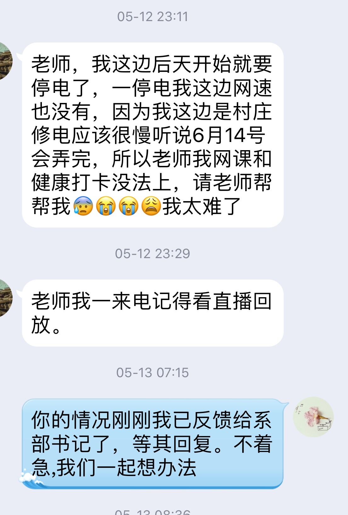 我系一名19級(jí)藏族學(xué)生在5月13日主動(dòng)和輔導(dǎo)員匯報(bào),所居住地(西藏林芝市工布江達(dá)縣江達(dá)鄉(xiāng)金村)電線壞了導(dǎo)致停電,維修預(yù)計(jì)需要近一個(gè)月時(shí)間。學(xué)生焦慮近一個(gè)月無(wú)法上網(wǎng)課。輔導(dǎo)員安慰學(xué)生、并電話學(xué)生家長(zhǎng)進(jìn)一步確認(rèn)情況,得知因疫情影響家里父母無(wú)法外出工作,家里無(wú)經(jīng)濟(jì)來(lái)源。藥學(xué)系領(lǐng)導(dǎo)高度重視,積極主動(dòng)為學(xué)生提供幫助。在學(xué)院相關(guān)部門大力支持下,按學(xué)院相關(guān)資助文件,向?qū)W生發(fā)放疫情防控專項(xiàng)臨時(shí)補(bǔ)助,幫助學(xué)生渡過(guò)難關(guān)。為解決學(xué)生停電期間學(xué)習(xí)困難問(wèn)題,輔導(dǎo)員與任課老師溝通,提前在線發(fā)送或線下郵寄給學(xué)生相關(guān)學(xué)習(xí)材料,讓學(xué)生停電不停學(xué);并讓班級(jí)班干部協(xié)助學(xué)生,予以相應(yīng)學(xué)業(yè)幫扶等。