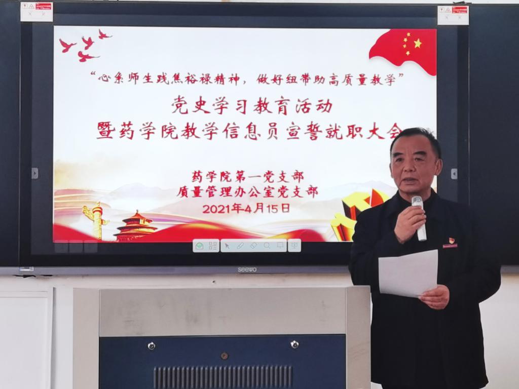 2021年4月15日,藥學(xué)院第一黨支部攜手校質(zhì)量管理辦公室黨支部,共同開(kāi)展了一場(chǎng)莊嚴(yán)的黨史學(xué)習(xí)教育,主題為“心系師生踐焦裕祿精神,做好紐帶助高質(zhì)量教學(xué)”。校紀(jì)委書(shū)記游鋒,藥學(xué)院黨總支書(shū)記鄭力宏,校質(zhì)管辦主任郭禮堅(jiān),藥學(xué)院第一黨支部、校質(zhì)管辦黨支部全體黨員及藥學(xué)院新聘教學(xué)信息員三十余人參加了活動(dòng)。本次活動(dòng)由藥學(xué)院第一黨支部副書(shū)記林玲主持。