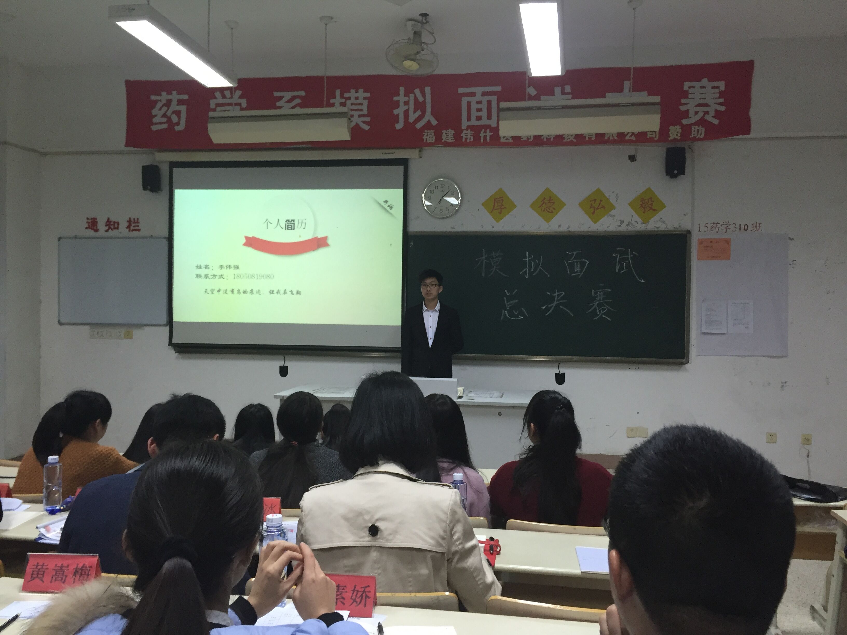 藥學(xué)系于3月29日晚在教學(xué)樓215教室舉辦模擬面試大賽總決賽。為更好地模擬醫(yī)藥企業(yè)面試場(chǎng)景,本次大賽特邀葛蘭素史克公司銷售大區(qū)經(jīng)理張少波先生,輝瑞公司銷售主管劉楚先生以及福建偉什醫(yī)藥科技有限公司人事經(jīng)理池化冰先生、HR專員鄭彬焮學(xué)姐到場(chǎng)擔(dān)任評(píng)委,藥學(xué)系蘇愛(ài)華書(shū)記及各輔導(dǎo)員們應(yīng)邀出席。