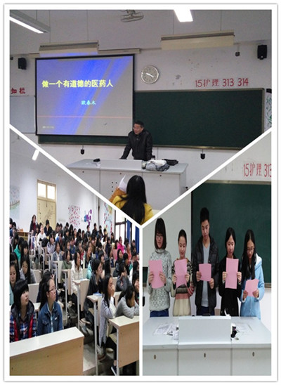 伴隨著同學(xué)們的掌聲,由15藥學(xué)301班帶來的詩朗誦《我,是醫(yī)學(xué)生》,拉開了道德講堂的序幕。第二環(huán)節(jié)觀看了第二軍醫(yī)大學(xué)東方肝膽外科醫(yī)院院長吳孟超同志的感人事跡視頻《妙手仁醫(yī)--吳孟超》,展現(xiàn)了醫(yī)務(wù)工作者的優(yōu)秀品質(zhì)和不懈追求,同學(xué)們都不禁被他高尚的人格、無私的胸懷、敬業(yè)的精神所折服,他為每一個醫(yī)藥工作者立起了學(xué)習(xí)的標(biāo)桿。隨后,由歐春木副教授給同學(xué)們帶來了《做一名有道德的醫(yī)藥人》的精彩講座。講座首先介紹了醫(yī)藥行業(yè)的特殊性,醫(yī)藥產(chǎn)品關(guān)系著人類的生命健康;其次,通過大量列舉國內(nèi)外案例,生動形象地分析了做一個有良心、有誠信、守規(guī)范的醫(yī)藥人員的重要性;最后,從調(diào)整健康的心態(tài)、養(yǎng)成良好的習(xí)慣、進(jìn)行有效的溝通和確定明確的目標(biāo)等方面教導(dǎo)學(xué)生培養(yǎng)良好的職業(yè)道德。