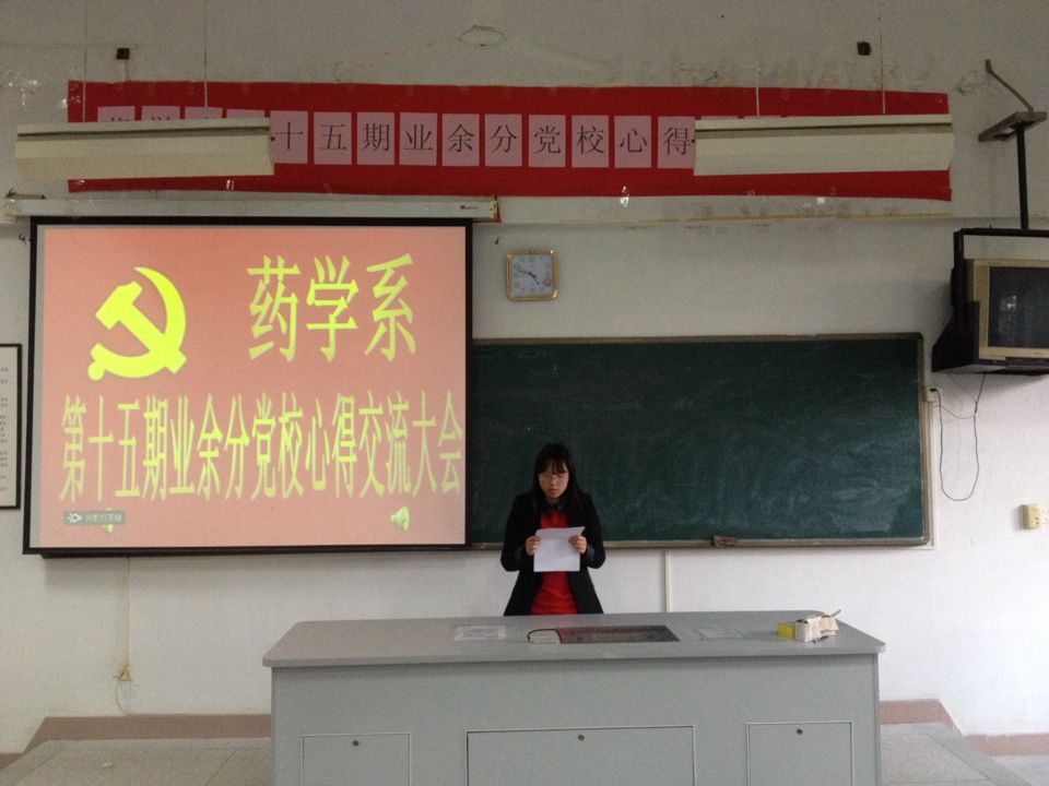 12月16日下午4:20,藥學(xué)系于系部二階開展藥學(xué)系第十五期業(yè)余分黨校心得交流大會(huì)。蒞臨本次大會(huì)的領(lǐng)導(dǎo)以及老師分別是:藥學(xué)系團(tuán)總支副書記李寶珠老師,輔導(dǎo)員胡丹老師,黃嵩梅老師。