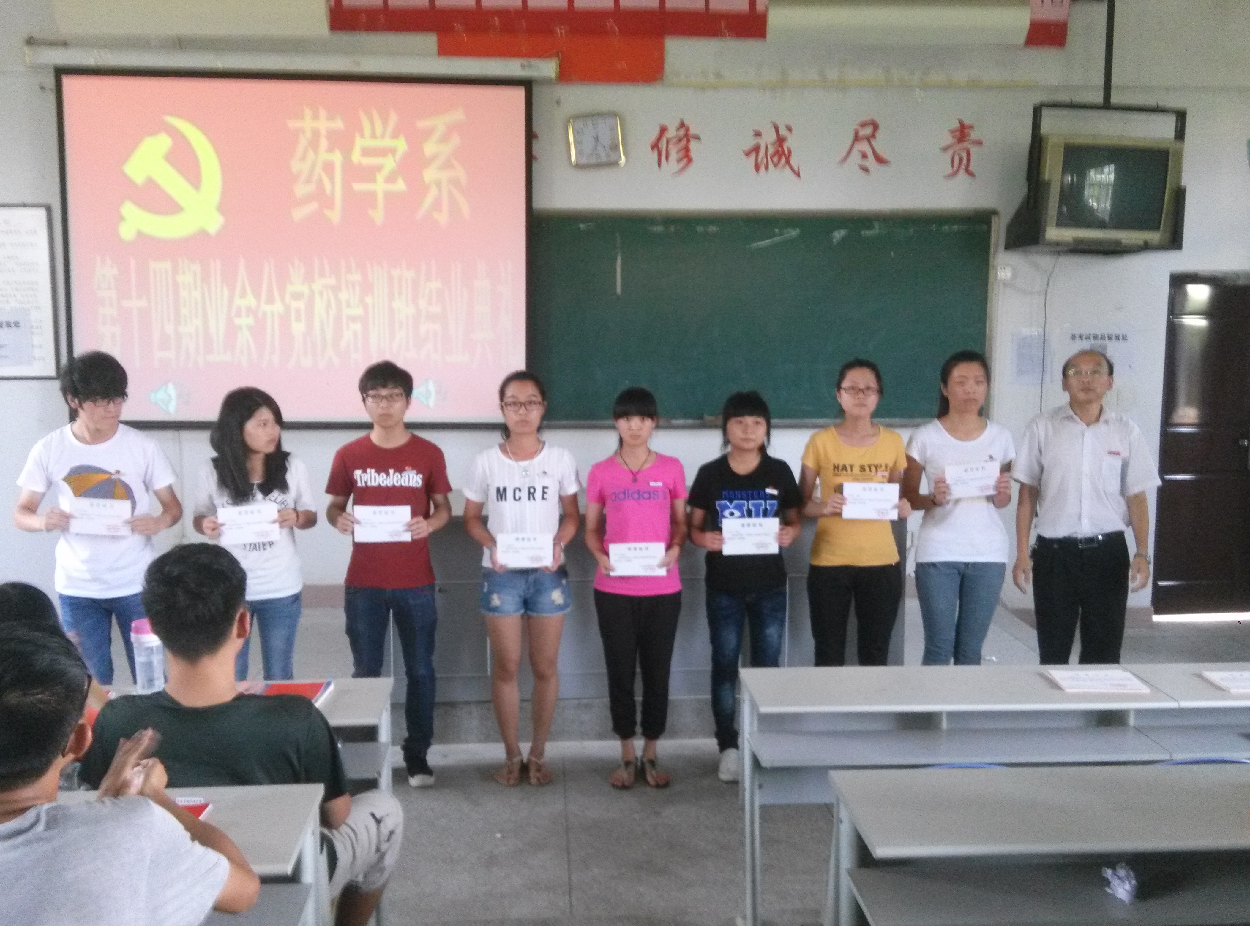 藥學(xué)系第十四期業(yè)余分黨校結(jié)業(yè)典禮于6月12日下午四點(diǎn)三十分在藥二階隆重召開(kāi)。藥學(xué)系黨總支書(shū)記蘇愛(ài)華、藥學(xué)系第二黨支部書(shū)記何舒瀾老師、學(xué)生黨書(shū)記陳瑜老師、藥學(xué)系團(tuán)總支副書(shū)記李寶珠老師、藥學(xué)系輔導(dǎo)員胡丹老師蒞臨了本次大會(huì)。大會(huì)在莊嚴(yán)的國(guó)歌中拉開(kāi)序幕,陳瑜老師宣讀業(yè)余分黨校優(yōu)秀學(xué)員名單并由藥學(xué)系第二黨支部書(shū)記何舒瀾老師為黨校學(xué)員和復(fù)訓(xùn)學(xué)員頒發(fā)結(jié)業(yè)證書(shū),藥學(xué)系蘇愛(ài)華書(shū)記為優(yōu)秀學(xué)員頒發(fā)榮譽(yù)證書(shū)。隨后,藥學(xué)系黨總支蘇愛(ài)華書(shū)記做重要講話,提出了各位學(xué)員在學(xué)習(xí)生活中要起模范帶頭作用,用黨員的標(biāo)準(zhǔn)要求自己,積極向黨組織靠攏,爭(zhēng)取早日入黨。最后優(yōu)秀學(xué)員代表上臺(tái)發(fā)表心得交流,他在發(fā)言中說(shuō)到要在日常生活中做到嚴(yán)于律己、腳踏實(shí)地,爭(zhēng)取思想和行動(dòng)同時(shí)入黨。