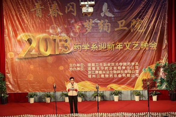 12月25日晚,學(xué)術(shù)廳張燈結(jié)彩、歌聲嘹亮,藥學(xué)系2013年“青春閃藥 夢絢衛(wèi)院”迎新年文藝晚會在這里隆重舉行。魏立娜副院長、學(xué)生工作處黃銘珊處長、院團(tuán)委宋維副書記、福建龍華藥業(yè)有限公司尹峰副總經(jīng)理、系主任倪峰博士、系黨總支蘇愛華副書記等系領(lǐng)導(dǎo)親臨晚會現(xiàn)場,與全系師生員工共慶良宵。