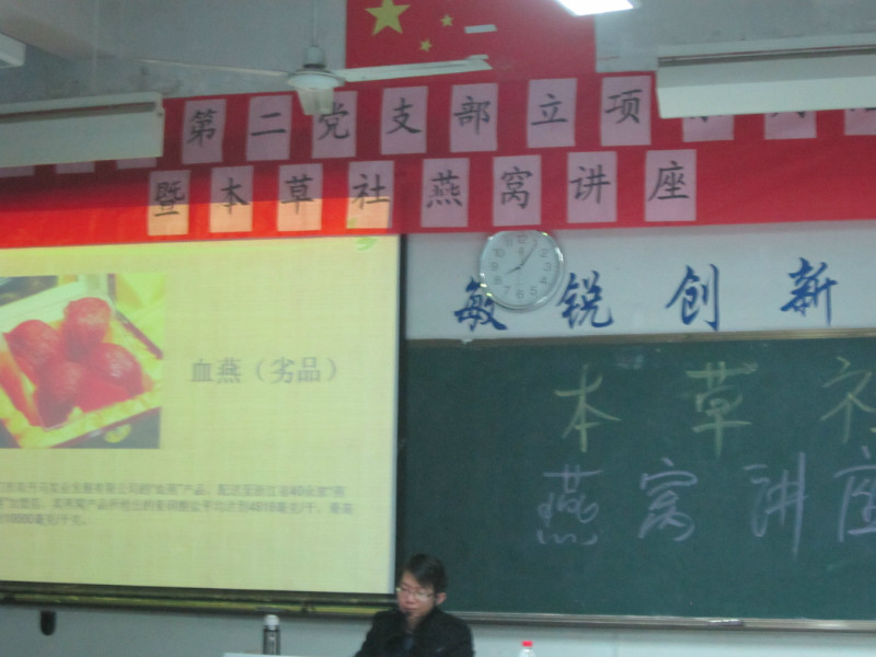 2013年3月7日晚上7:30,為豐富藥學(xué)系學(xué)生會(huì)本草社社團(tuán)活動(dòng)內(nèi)容,提升本草社社員們的專業(yè)素養(yǎng),藥學(xué)系第二黨支部、藥學(xué)系學(xué)生會(huì)本草社在藥學(xué)系第一階梯教室聯(lián)合舉辦首場(chǎng)專業(yè)講座——《燕窩的采收與鑒定》。本次講座的主講人是藥學(xué)系第二黨支部書(shū)記、中藥教研室的何舒瀾老師。通過(guò)何舒瀾老師由淺入深、圖文并茂的講演,廣大社員對(duì)燕窩的來(lái)源、形成、采收、分級(jí)、真?zhèn)蝺?yōu)劣鑒定及食用方法等方面都有了新的認(rèn)識(shí),拓展了視野,豐富了專業(yè)知識(shí),也提高了社員們的養(yǎng)生保健意識(shí)。講座后本草社長(zhǎng)李明俊和系社團(tuán)部長(zhǎng)林雨頭同學(xué)針對(duì)講座開(kāi)展的形式和內(nèi)容征求了社員們的意見(jiàn),大家普遍感覺(jué)收獲不小,激發(fā)了學(xué)習(xí)中藥知識(shí)的熱情,希望以后類似講座能多多開(kāi)展。