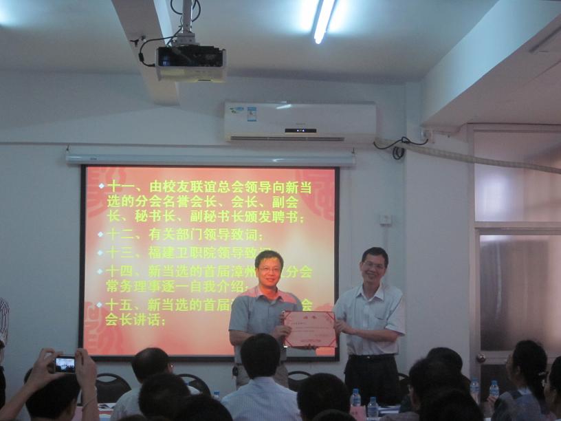 會(huì)上,漳州市醫(yī)院藥學(xué)部李碧峰主任作為籌備組代表向與會(huì)人員報(bào)告漳州校友分會(huì)籌備情況;與會(huì)代表審議并表決通過漳州校友分會(huì)章程,選舉產(chǎn)生了首屆漳州校友分會(huì)理事、常務(wù)理事,首屆漳州校友分會(huì)會(huì)長(zhǎng)、副會(huì)長(zhǎng)、秘書長(zhǎng)及副秘書長(zhǎng),并由我院廖偉堅(jiān)副院長(zhǎng)向新當(dāng)選的漳州校友分會(huì)領(lǐng)導(dǎo)頒發(fā)聘書。