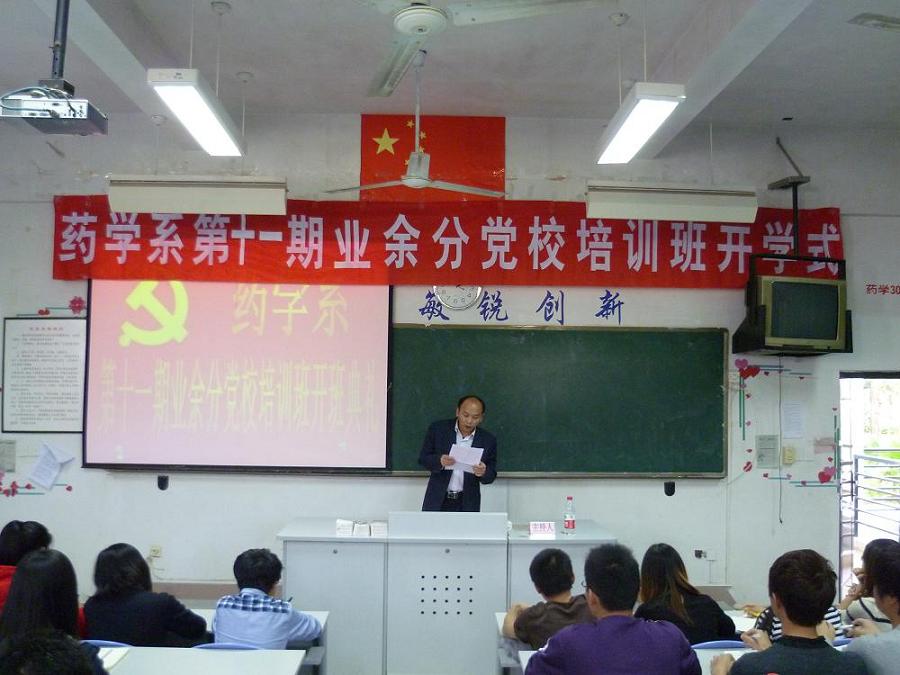 藥學(xué)系第十一期業(yè)余分黨校培訓(xùn)班開班典禮于11月13日在藥學(xué)系第一階梯教室舉行。藥學(xué)系黨總支蘇愛華副書記、系第一黨支部委員何烜老師、系第二黨支部書記何舒瀾老師、系團(tuán)總支書記王鈍銳老師、輔導(dǎo)員陳瑜老師、康婷婷老師、林麗鳳老師出席了本次開班典禮。