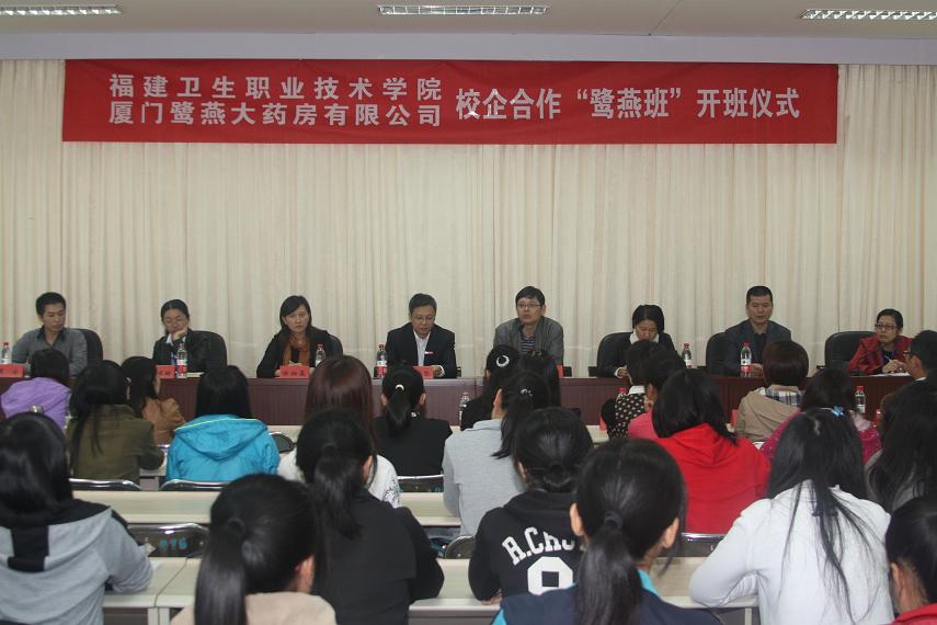 11月15日,我院與廈門鷺燕集團(tuán)的校企合作鷺燕班開班儀式在我院行政樓舉行。出席儀式的有副院長廖偉堅(jiān)、廈門鷺燕集團(tuán)副總裁朱明國先生、廈門鷺燕大藥房有限公司總經(jīng)理陳湘荔女士和鷺燕集團(tuán)的相關(guān)領(lǐng)導(dǎo)以及我院學(xué)生處、教務(wù)處等相關(guān)部門負(fù)責(zé)人。會議由福建衛(wèi)生職業(yè)技術(shù)學(xué)院藥學(xué)系倪峰主任主持。參加儀式的還有廈門鷺燕班的40名學(xué)生。