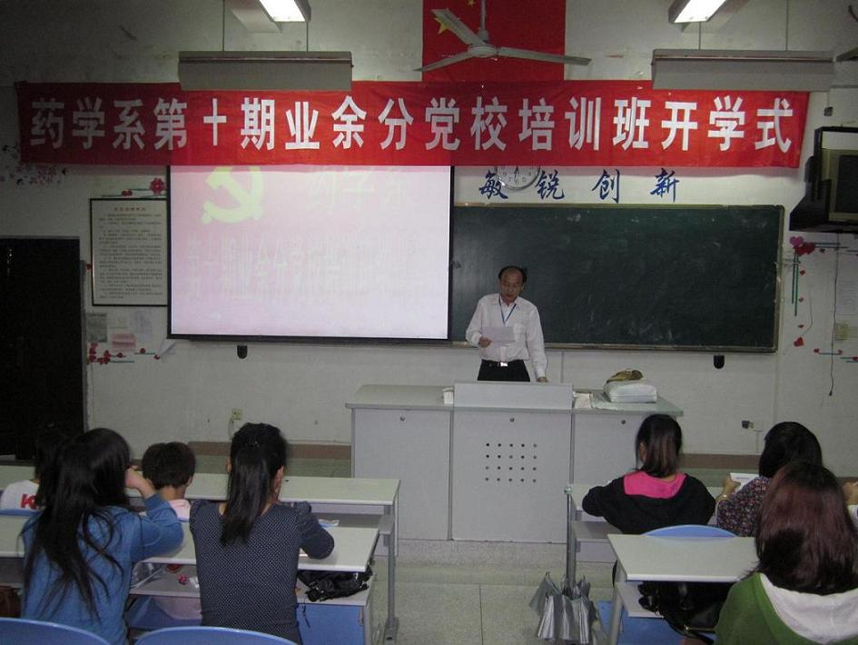 藥學系于2012年5月3日下午在藥學系第一階梯教室舉行第十期業(yè)余分黨校培訓班開班典禮。藥學系黨總支蘇愛華副書記、系團總支書記王鈍銳老師、系團總支副書記陳炳秀老師、輔導員陳瑜老師出席了本次開班典禮。