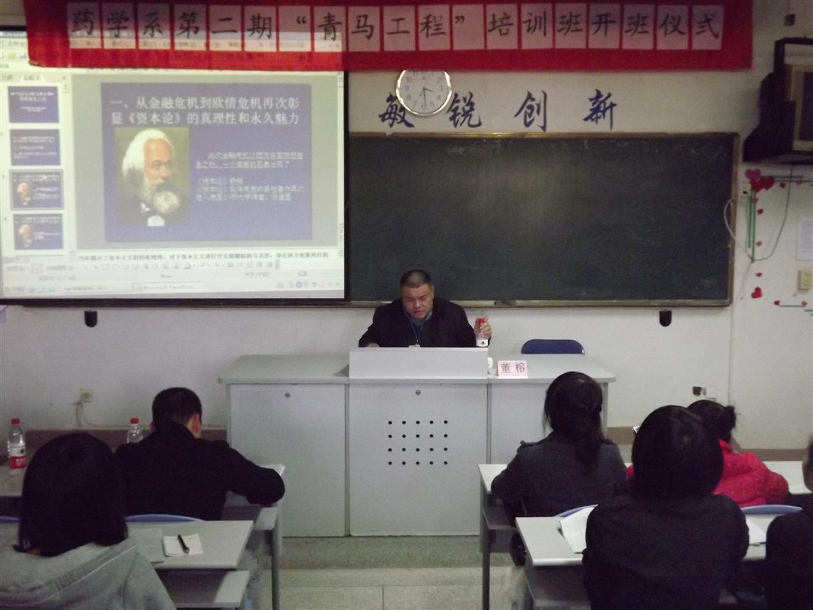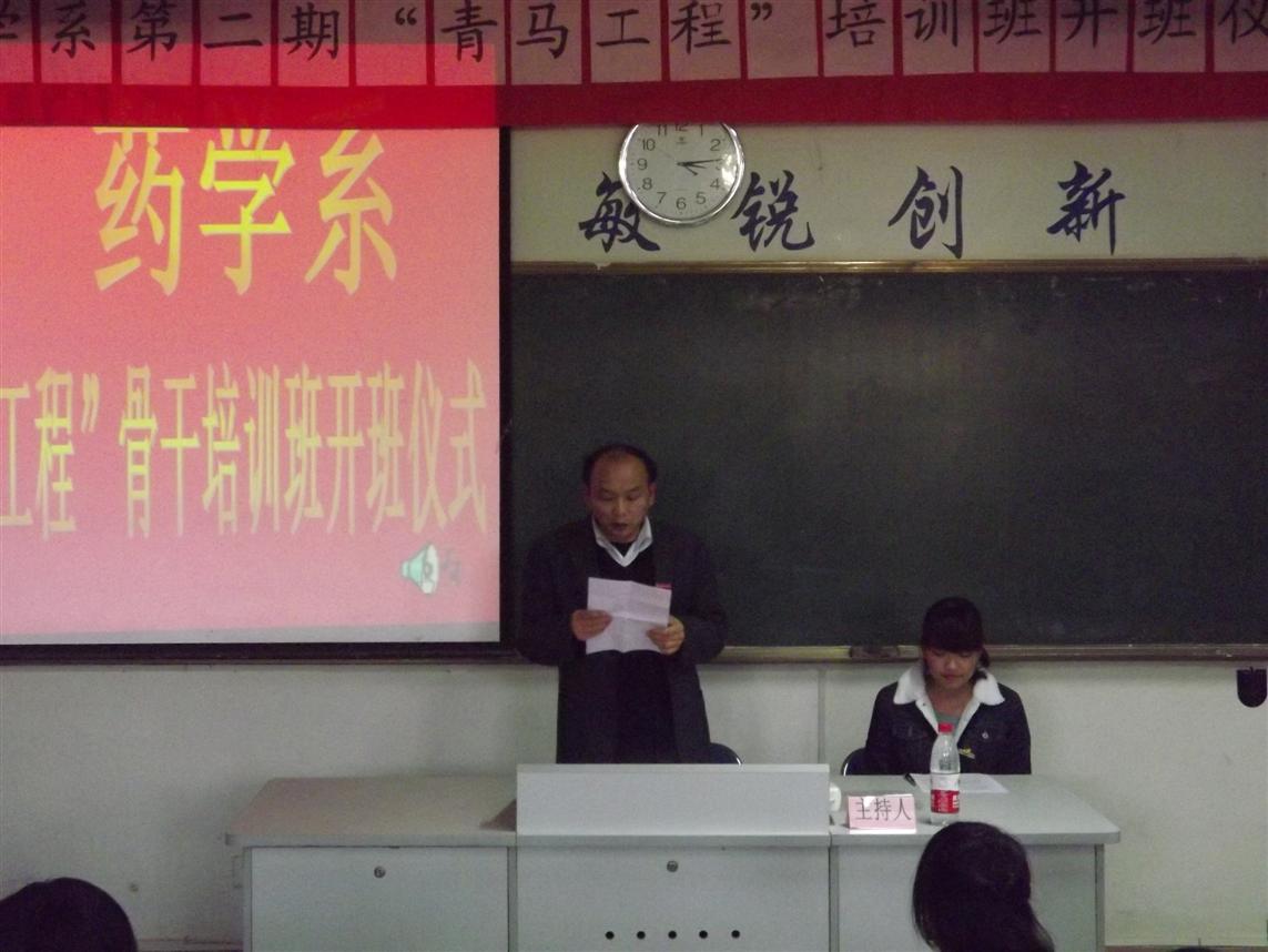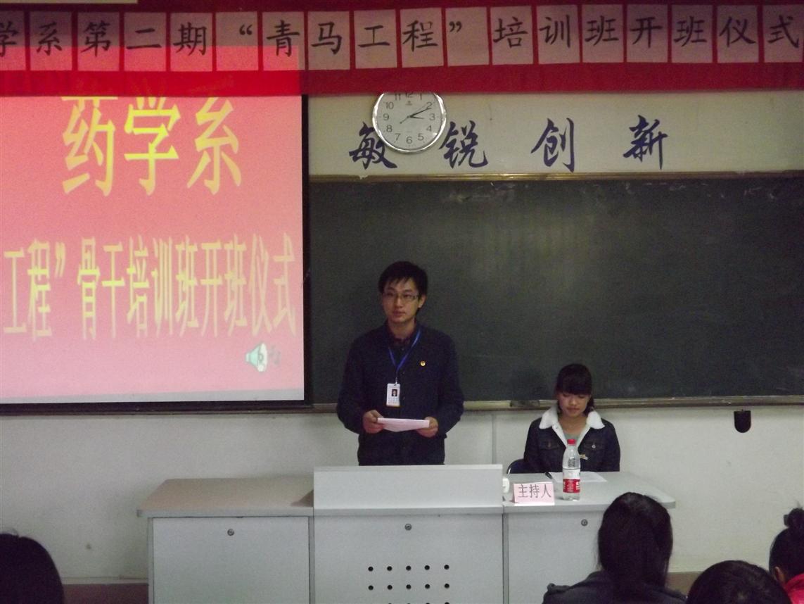 開班儀式在莊嚴的國歌中拉開了序幕。首先系團總支書記王鈍銳老師宣讀第二期青馬工程培訓(xùn)班學(xué)員名單和“青馬工程”培訓(xùn)班守則,并希望同學(xué)們能夠自覺遵守;接著,學(xué)員代表鄭彬焮同學(xué)發(fā)言,她號召廣大學(xué)員珍惜此次的學(xué)習(xí)機會,做一名名副其實的青年馬克思主義者和為同學(xué)服務(wù)的學(xué)生干部;接著,院團委宋維書記希望全體學(xué)員能夠深刻理解科學(xué)發(fā)展觀和社會主義核心價值體系的科學(xué)內(nèi)涵,并用到現(xiàn)實的學(xué)習(xí)和生活中。最后,藥學(xué)系黨總支蘇愛華書記做重要講話,他希望全體學(xué)員加強自身的思想教育,不斷提高自身的素質(zhì),在同學(xué)中起模范作用。