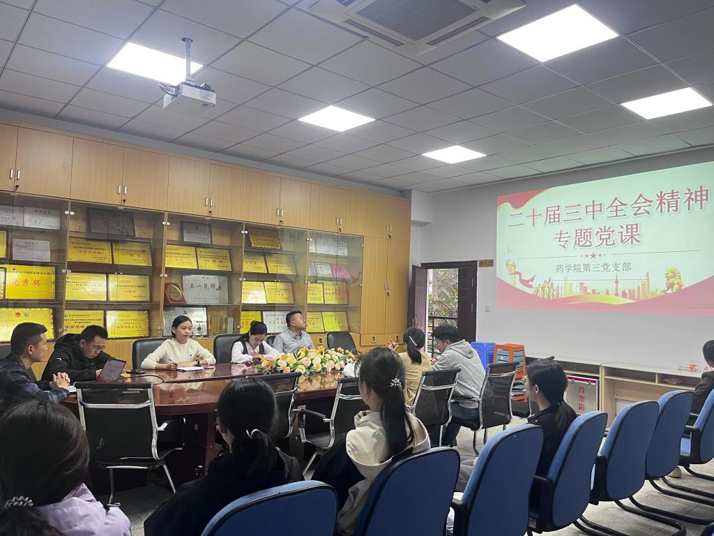 為深入學(xué)習(xí)貫徹黨的二十屆三中全會(huì)精神,11月20日下午,藥學(xué)院第三黨支部在藥學(xué)院會(huì)議室開(kāi)展學(xué)習(xí)貫徹黨的二十屆三中全會(huì)精神專題黨課。