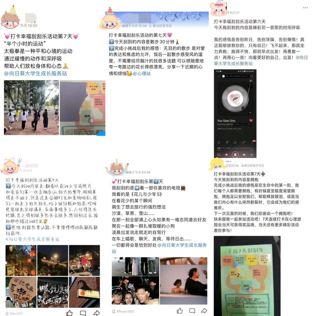 每天一張超有料的刮刮卡,就像是哆啦A夢的神奇口袋。輕輕刮開那神秘的涂層,哇塞!有可能蹦出一句超燃的勵志語,“今日的你,就是無敵小戰(zhàn)士,沖呀!”感覺全身都充滿了力量;也說不定會得到一份超甜的小福利——“獎勵自己去看一場超棒的電影喲”。同學(xué)們也紛紛分享“幸福刮刮樂”的奇妙體驗?;顒悠陂g,同學(xué)們發(fā)布分享數(shù)超1000條。