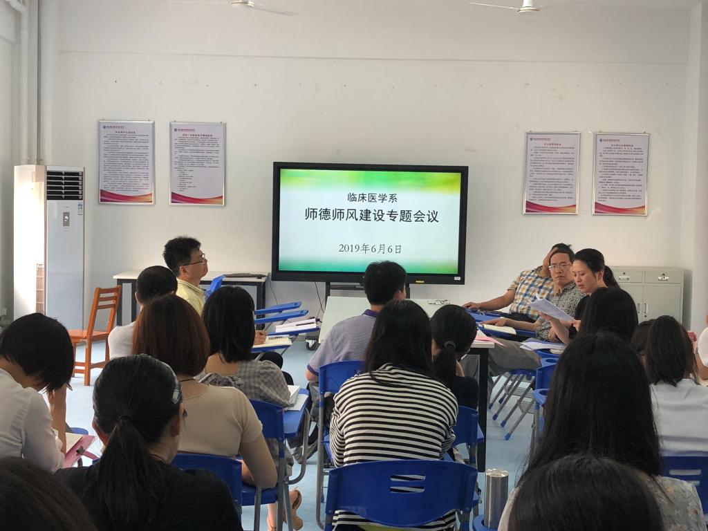 2019年6月6日下午,臨床醫(yī)學(xué)系在實(shí)訓(xùn)樓401室召開師德師風(fēng)建設(shè)專題會議,臨床醫(yī)學(xué)系全體教職工參加了會議,會議由郭禮堅主任主持。