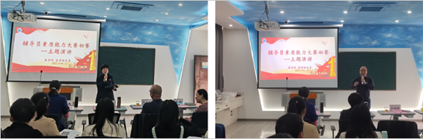 比賽現(xiàn)場,兩個院系黨總支書記柯瓊鶯、邱滾忠為輔導員們精彩的表現(xiàn)進行點評。