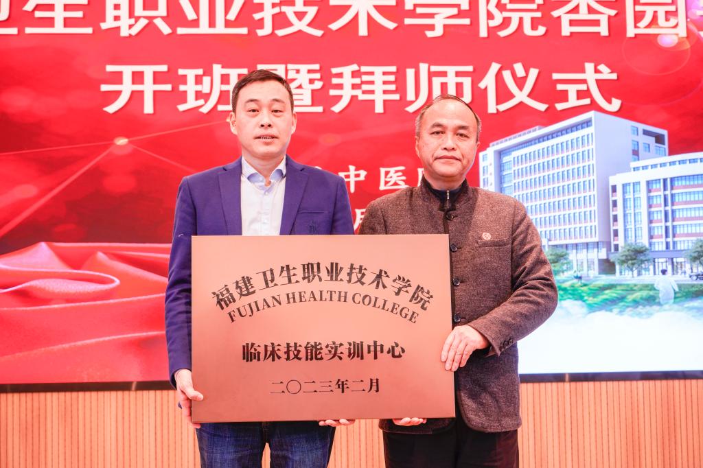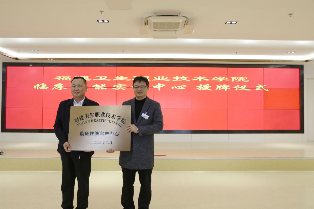 校黨委書記曾武祈(左)與福州市中醫(yī)院院長楊曉煜(右)共同為“臨床技能實(shí)訓(xùn)中心”揭牌授牌