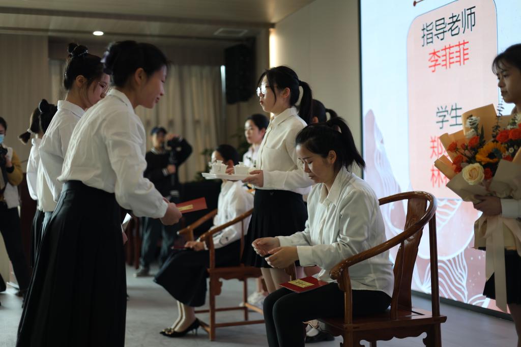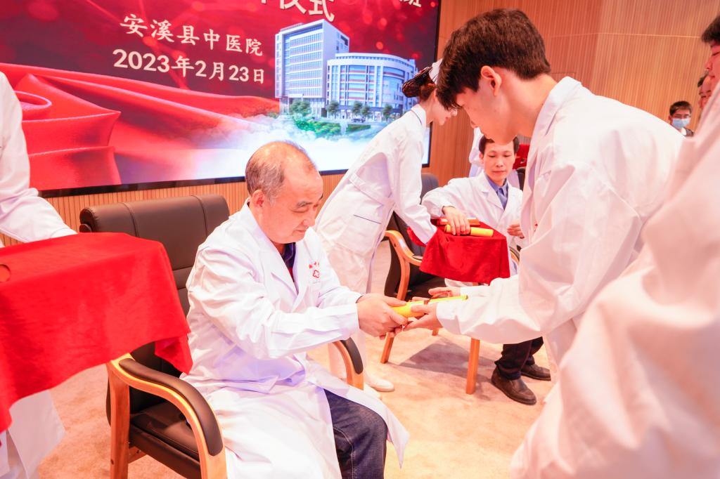 拜師儀式上,學(xué)生們按照傳統(tǒng)中醫(yī)學(xué)徒拜師禮儀,分別向各自導(dǎo)師呈拜師帖、奉茶、獻(xiàn)花、鞠躬行禮。