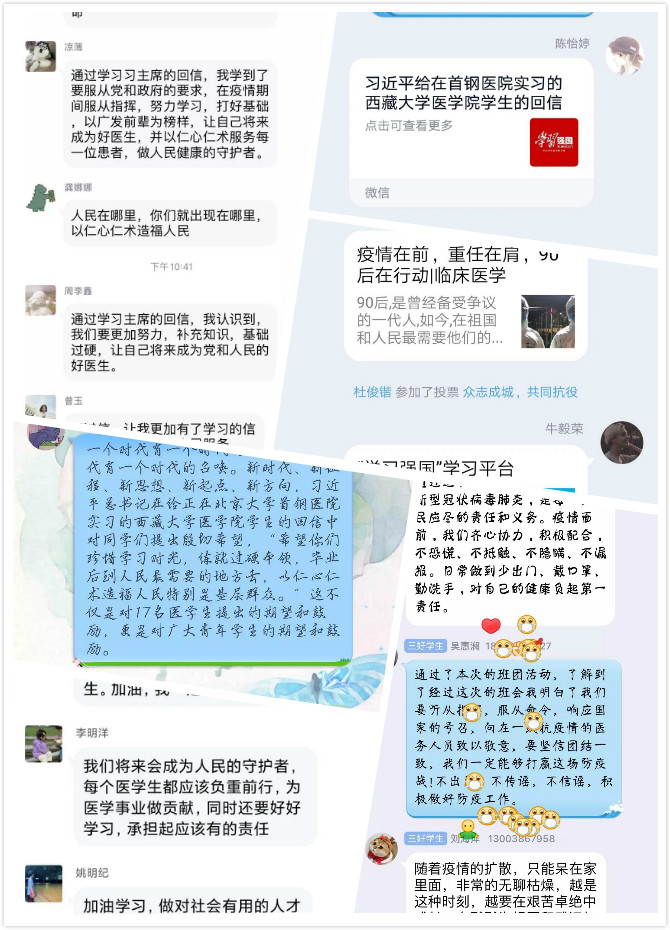 同學(xué)們紛紛表示要牢記習(xí)近平總書記囑托,認(rèn)真學(xué)習(xí)醫(yī)學(xué)專業(yè)知識(shí),練就過(guò)硬本領(lǐng),以?shī)^戰(zhàn)在新冠肺炎疫情防控斗爭(zhēng)中的醫(yī)務(wù)工作者為榜樣,聽(tīng)黨指揮,盡早投身祖國(guó)的醫(yī)療衛(wèi)生事業(yè)中,做黨和人民信賴的好醫(yī)生。