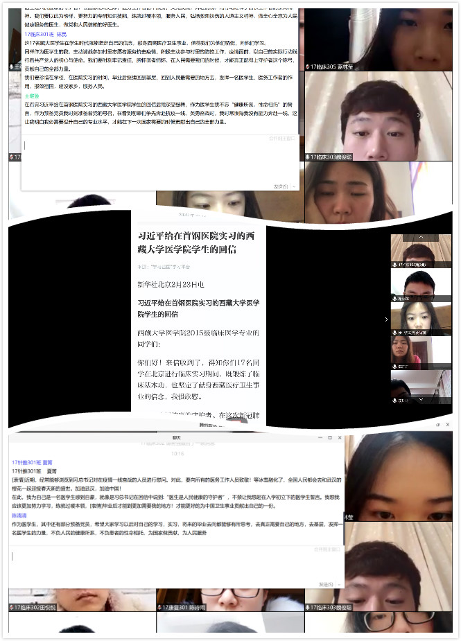 2月21日,習(xí)近平總書記給正在北京大學(xué)首鋼醫(yī)院實(shí)習(xí)的西藏大學(xué)醫(yī)學(xué)院學(xué)生回信,肯定他們獻(xiàn)身西藏醫(yī)療衛(wèi)生事業(yè)的志向,勉勵(lì)他們練就過(guò)硬本領(lǐng)、服務(wù)基層人民,并向他們以及藏區(qū)各族群眾致以節(jié)日的問(wèn)候和美好的祝愿。隨后引起我系師生的熱議,2月24日上午,在我系團(tuán)總支書記陳清清、副書記謝林輝主持下,組織開(kāi)展了線上學(xué)習(xí)會(huì)議,18級(jí)團(tuán)學(xué)干部、17級(jí)實(shí)習(xí)生代表共同參加了學(xué)習(xí);25日晚上,我系團(tuán)總支組織各團(tuán)支部召開(kāi)線上主題團(tuán)日活動(dòng)。